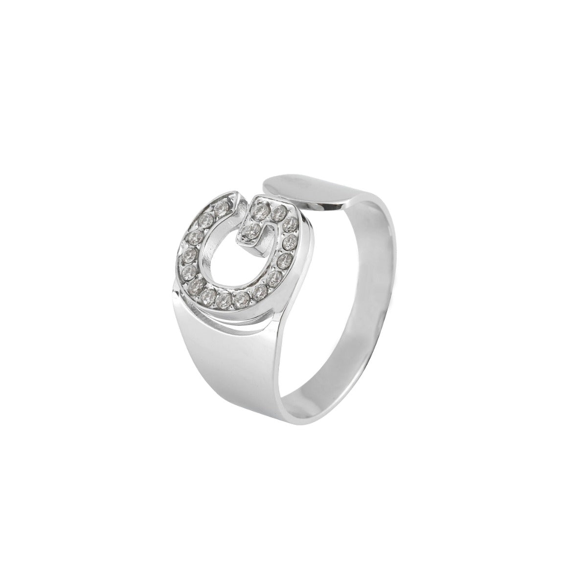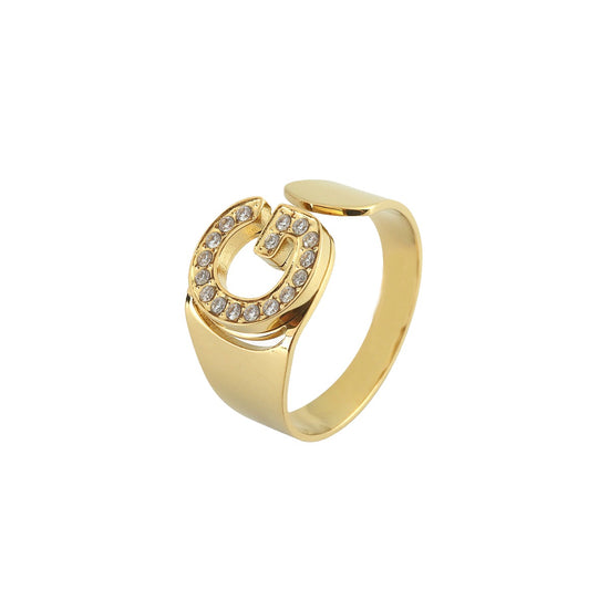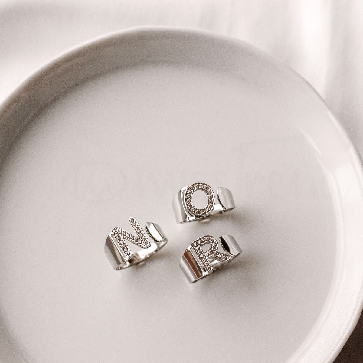 Anel ajustável de aço inoxidável com letra e zircônias.