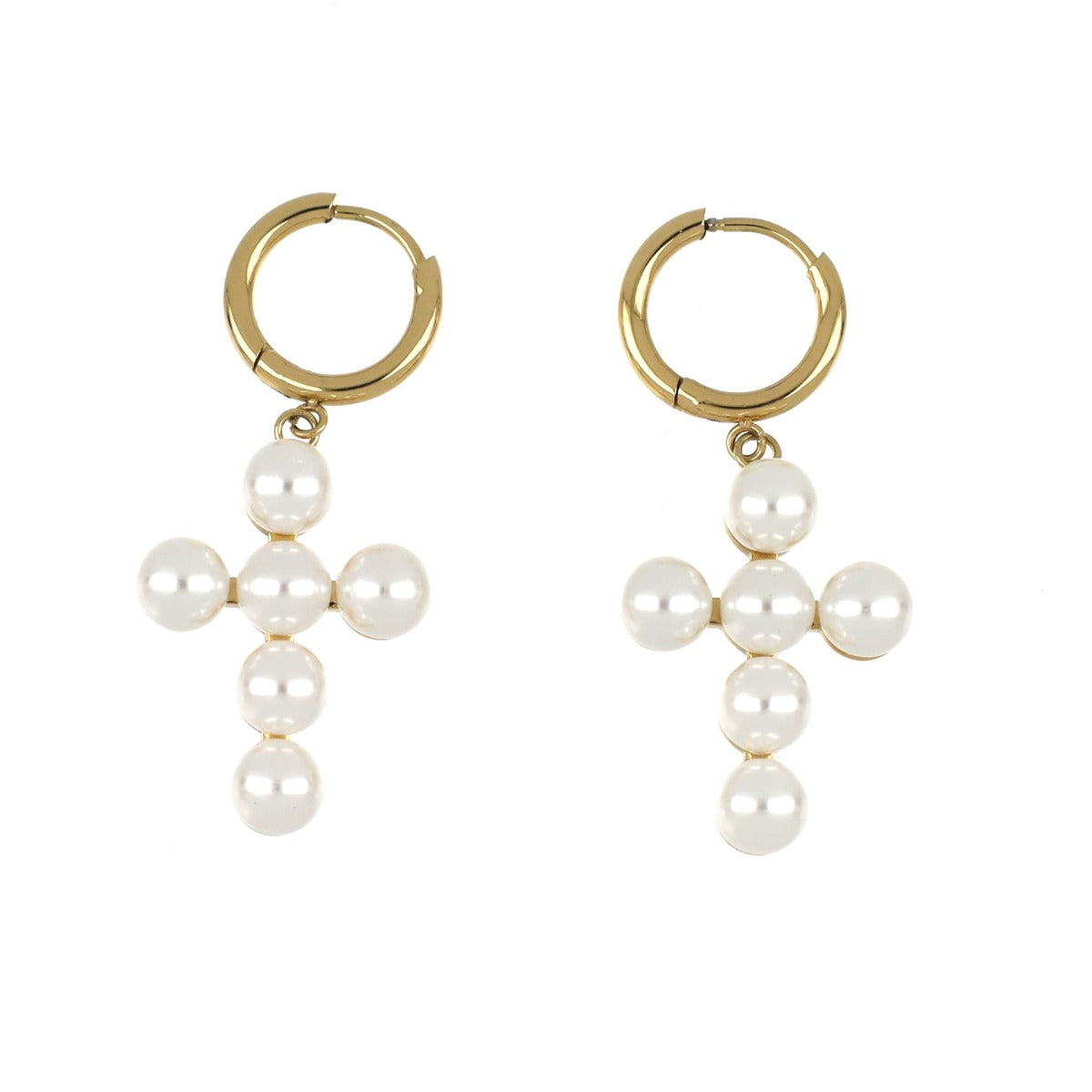 Brincos com cruz com pérolas. Artigo em aço inoxidável.