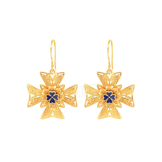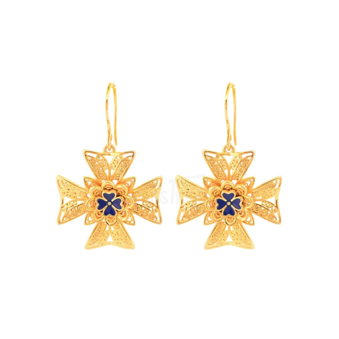 Brincos com Cruz de Malta em aço com banho de ouro.
