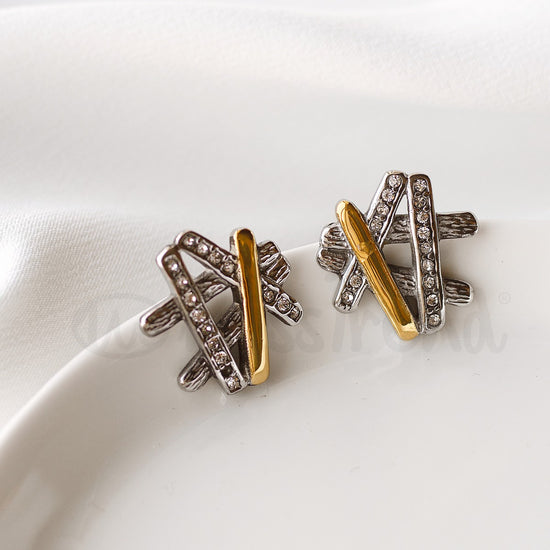 Brincos Elite prateados com detalhes dourado e com diamantes.