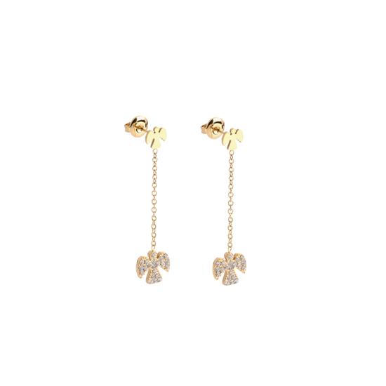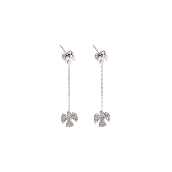 Brincos em aço inoxidável com dois pendentes com anjo, um deles com zircônias brancas.