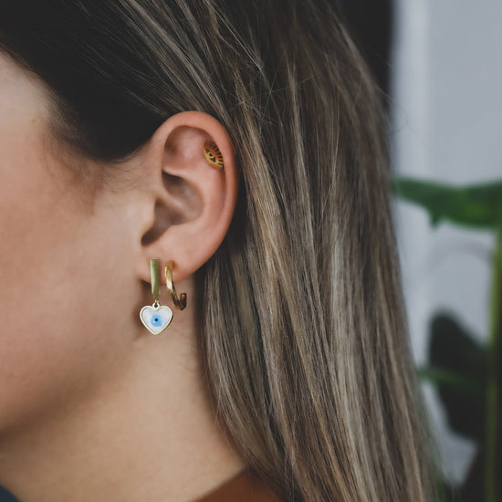 Pack de 3 brincos - inclui um par de argolas, um par de brincos em formato olho grego e um par de brincos com pendente coração com olho grego azul com madre pérola.