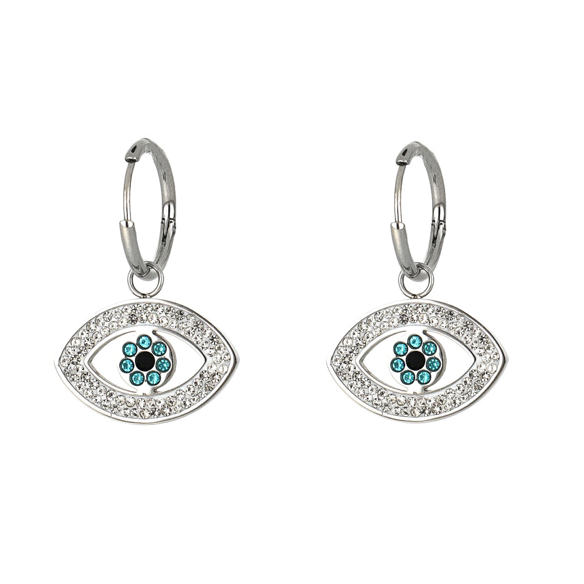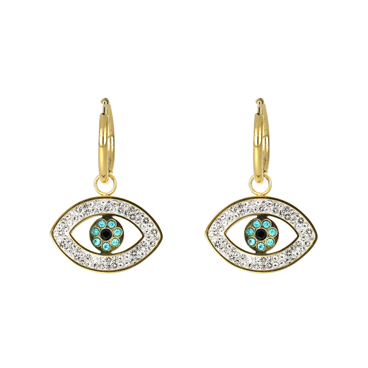 Brinco em argola com pendente olho turco com brilhantes brancos e azuis.