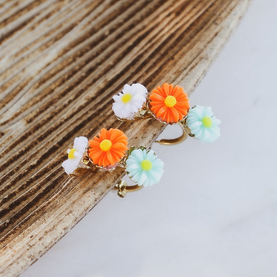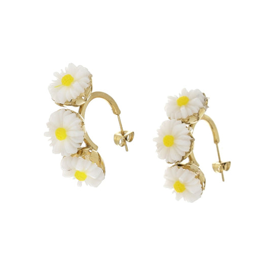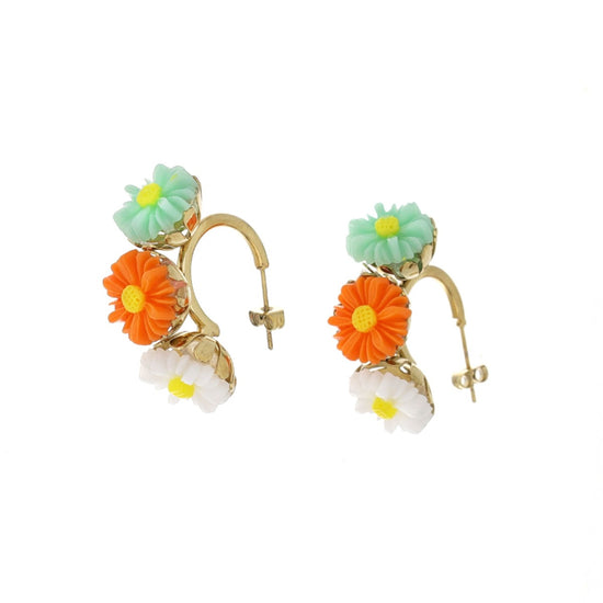 Brincos em meia argola com três flores em silicone e composição em aço inoxidável.