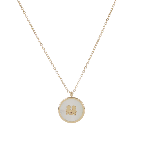 Colar ajustável com pendente redondo com dois meninos ou duas menina com fundo madre pérola.