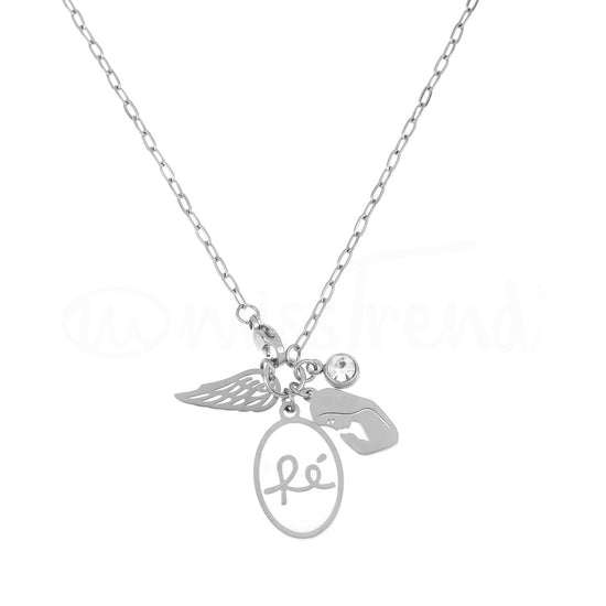 Colar Anjos da Fé em Aço com 4 pendentes. Pendente com palavra fé, cristal cravado, asa de anjo e imagem de uma santinha.