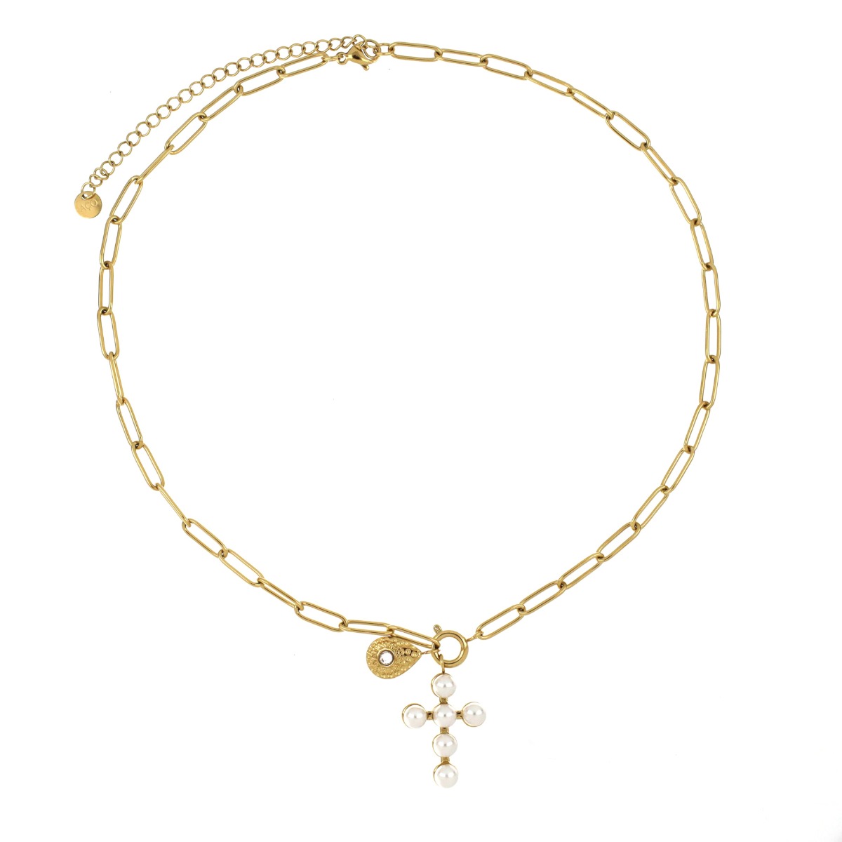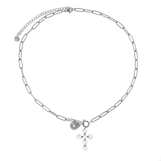 Colar composto por argolas com dois pendentes. Pendente cruz com pérolas e pendente oval com um brilhante cravado.