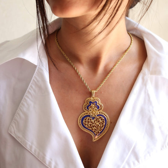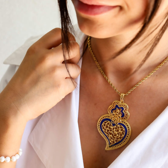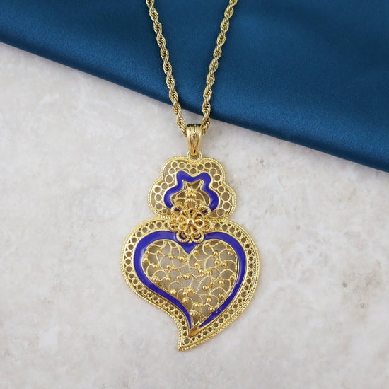 Colar com Medalha Coração de Viana com detalhes em tons de azuis.