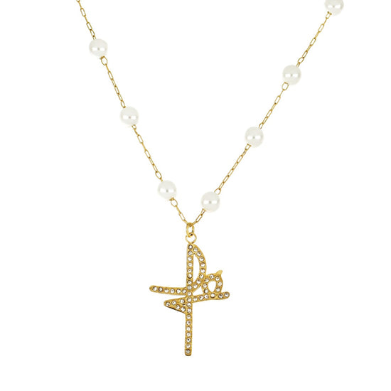 Colar com pérolas com pendente Fé com brilhantes cravados.