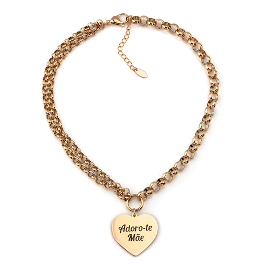 Colar composto por argolas, um dos lados com duas tiras. Projetado com pendente em formato de coração com dedicatória Adoro-te Mãe.