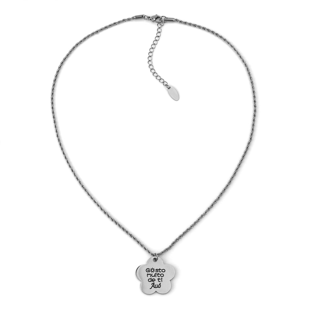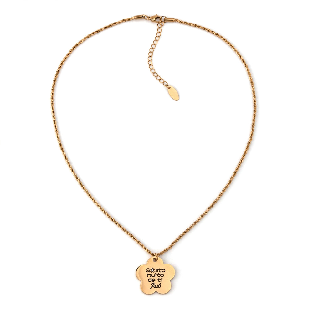 Colar com pendente trevo com dedicatória Gosto Muito de ti Avó com brilhantes cravado.