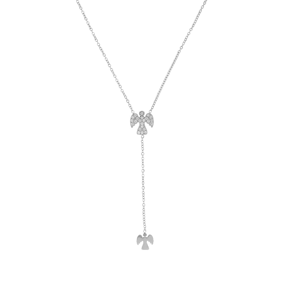 Colar em aço inoxidável com dois pendentes com anjo , um deles com zircônias brancas.