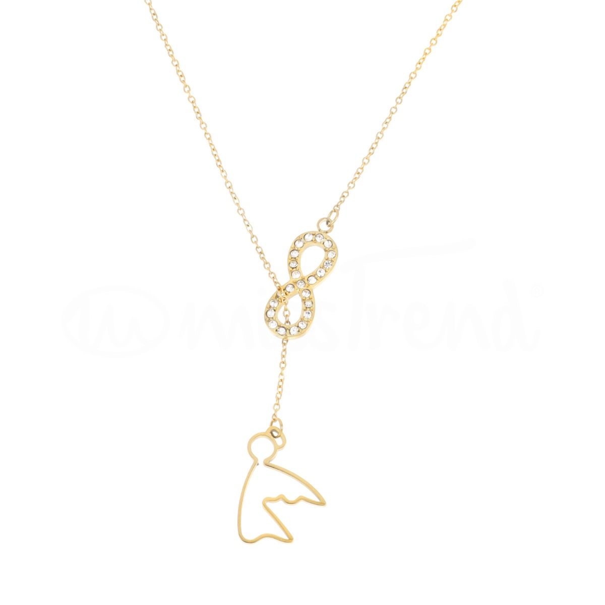 Colar Infinito com brilhantes cravados com pendente anjo. Artigo em aço inoxidável.
