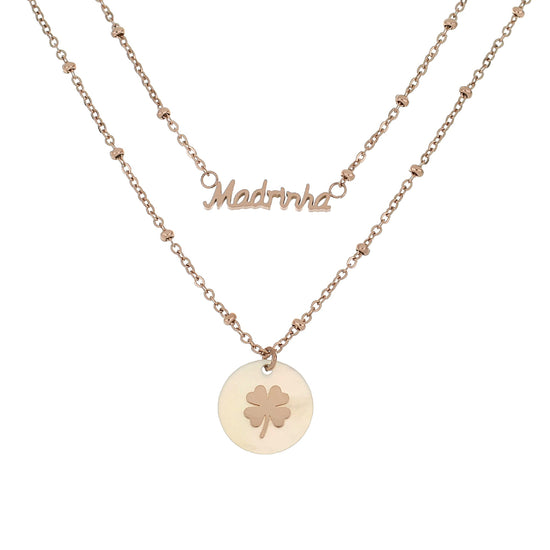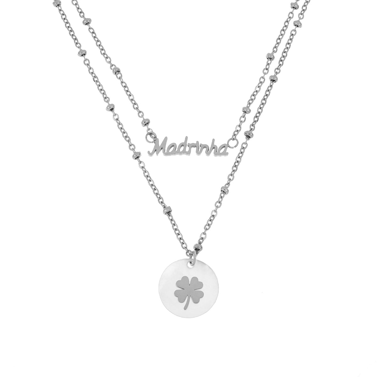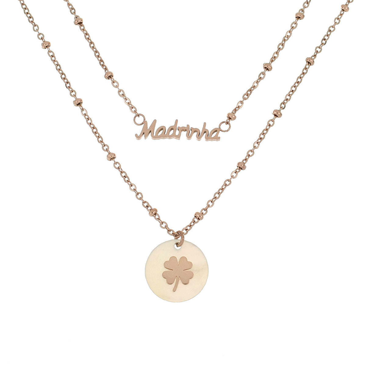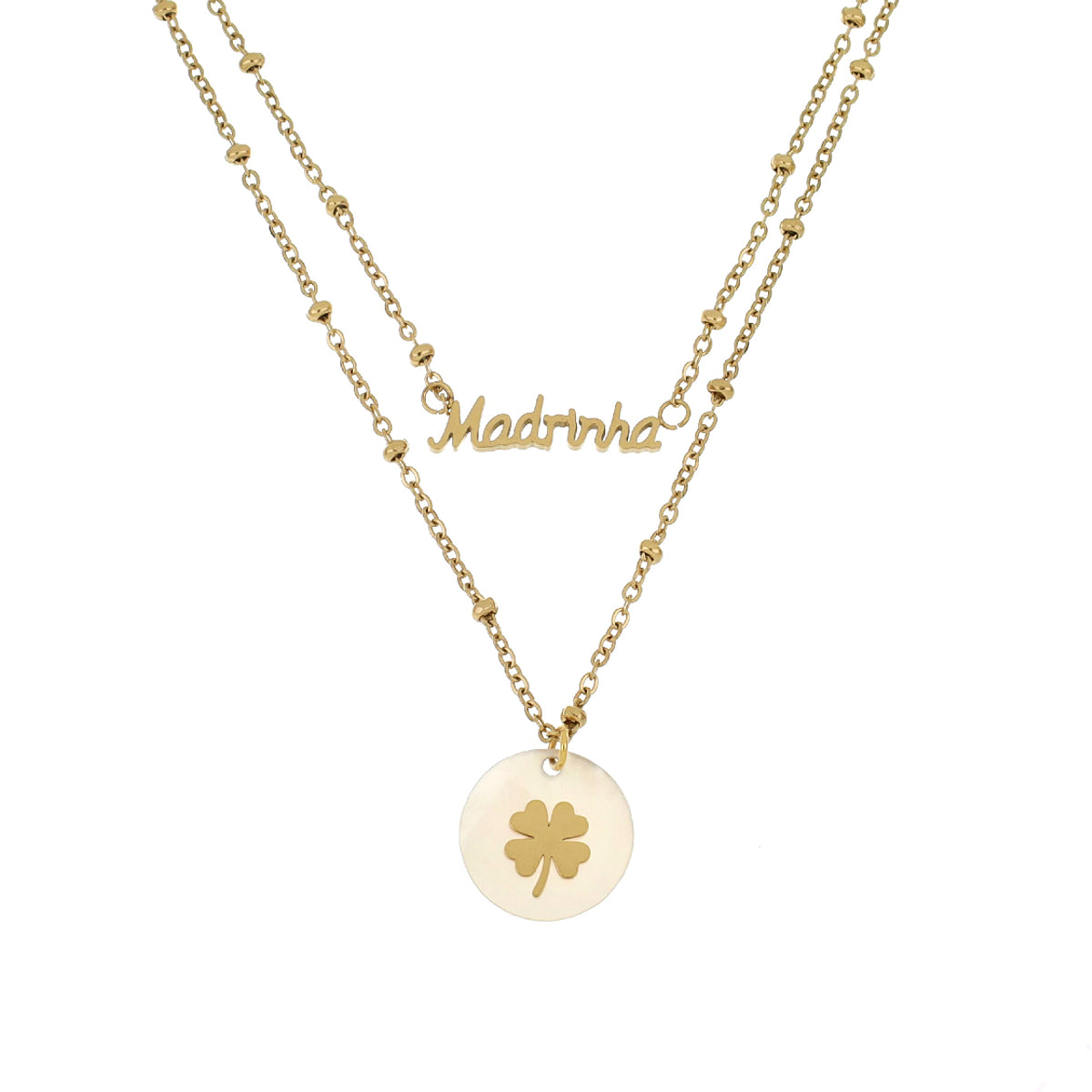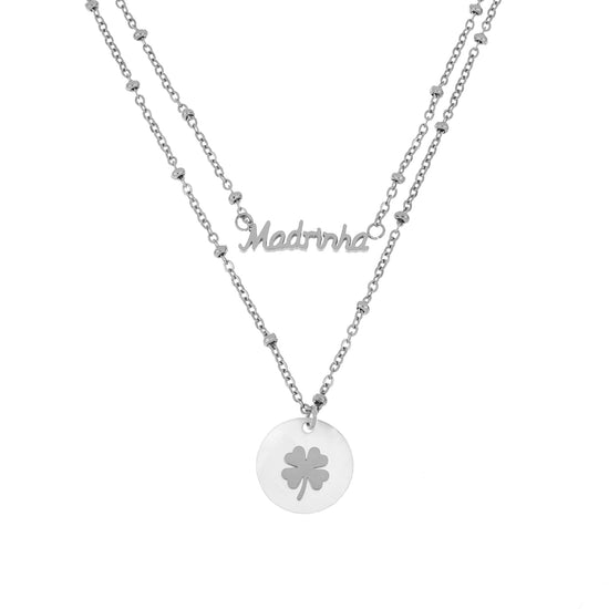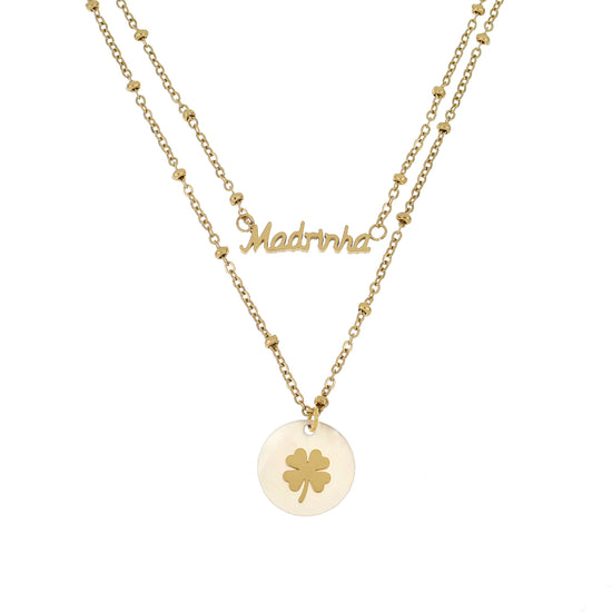 Colar com duas tiras com pendente redondo madre pérola com trevo e pendente com dedicatória Madrinha.