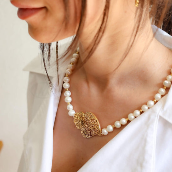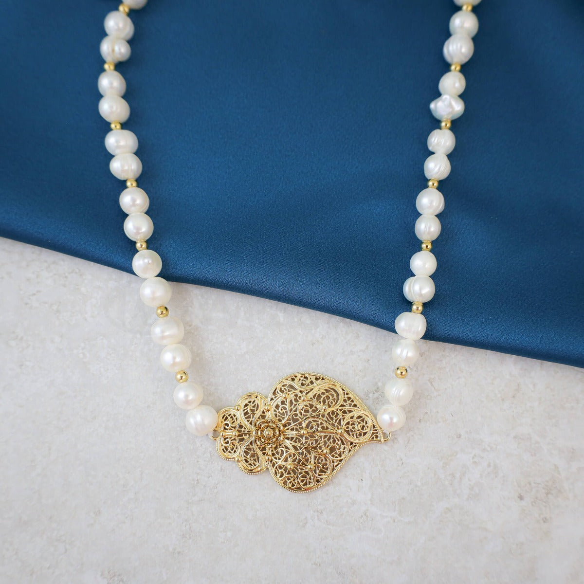 Colar Pérolas Medalha Coração de Viana em Banho de Ouro