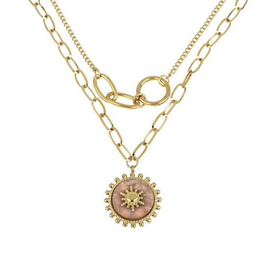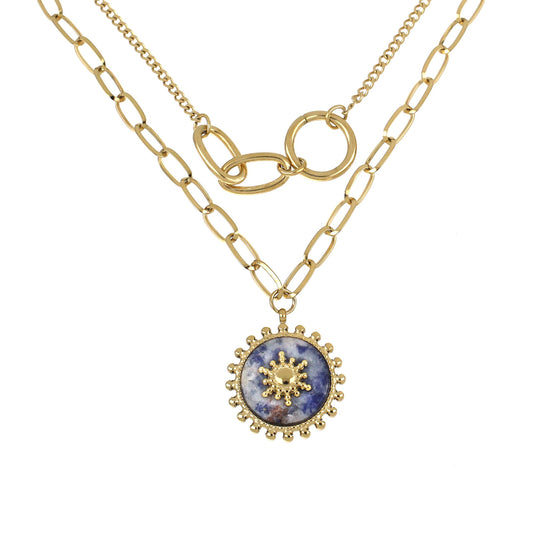 Colar com duas correntes com pendente redondo com pedra de fundo em mármore colorida.
