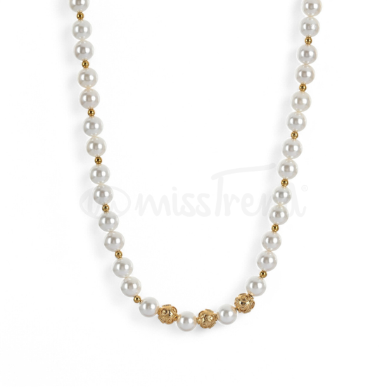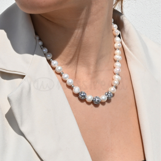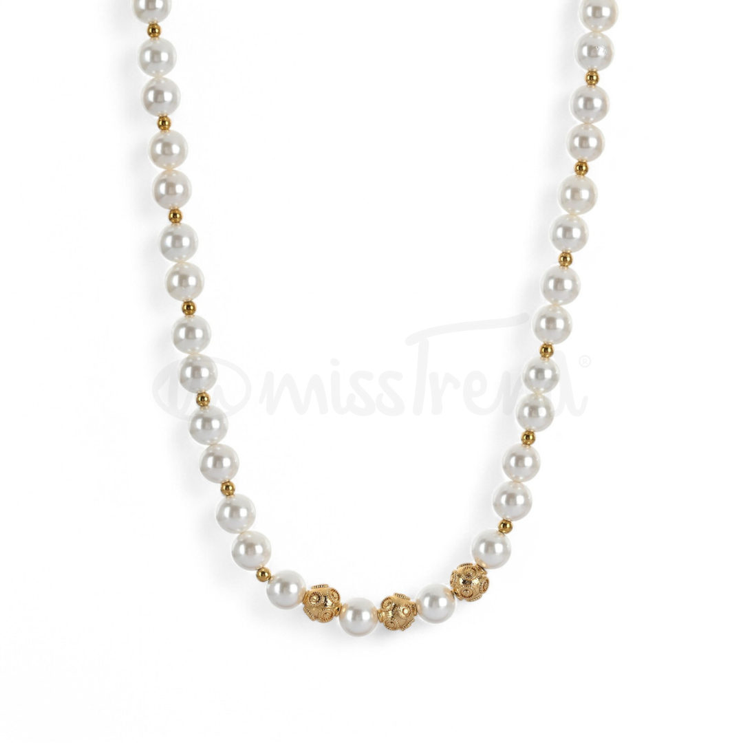 Uma joia que une tradição, elegância e funcionalidade. Este colar combina a delicadeza natural das pérolas de água doce com o simbolismo da Bola de Viana, uma peça icónica da ourivesaria portuguesa.