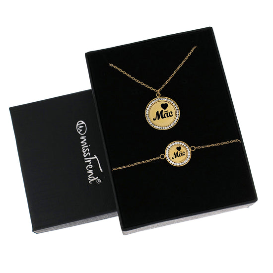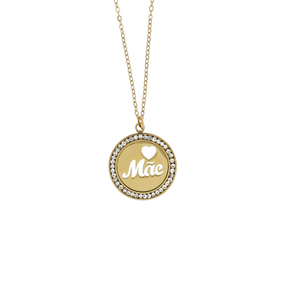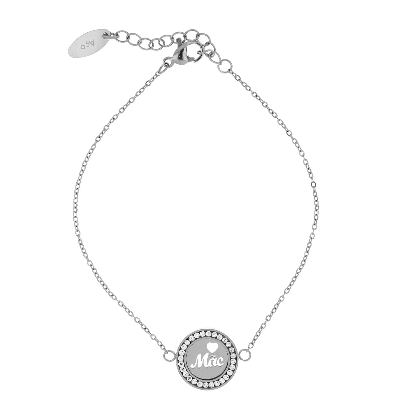 Coleção dedicada às mães. Artigo em aço inoxidável com pendente com brilhantes e coração recortado com a dedicatória mãe.