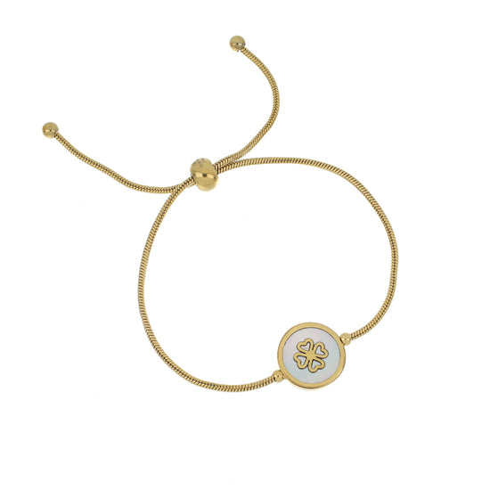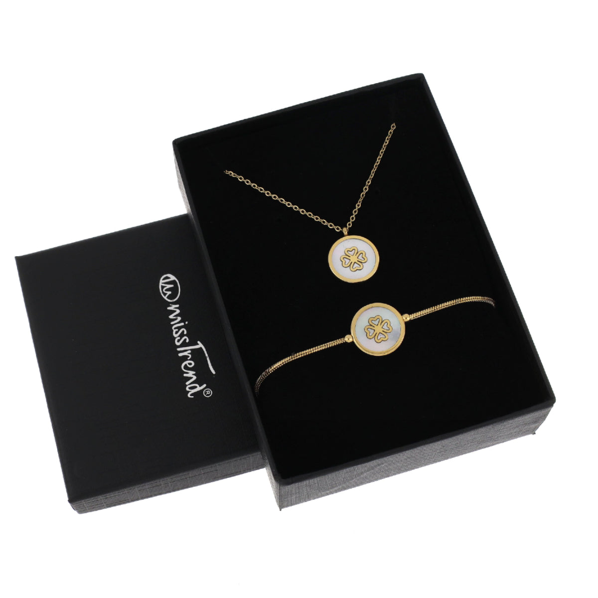 Conjunto Trevo Madre Pérola em aço inoxidável.