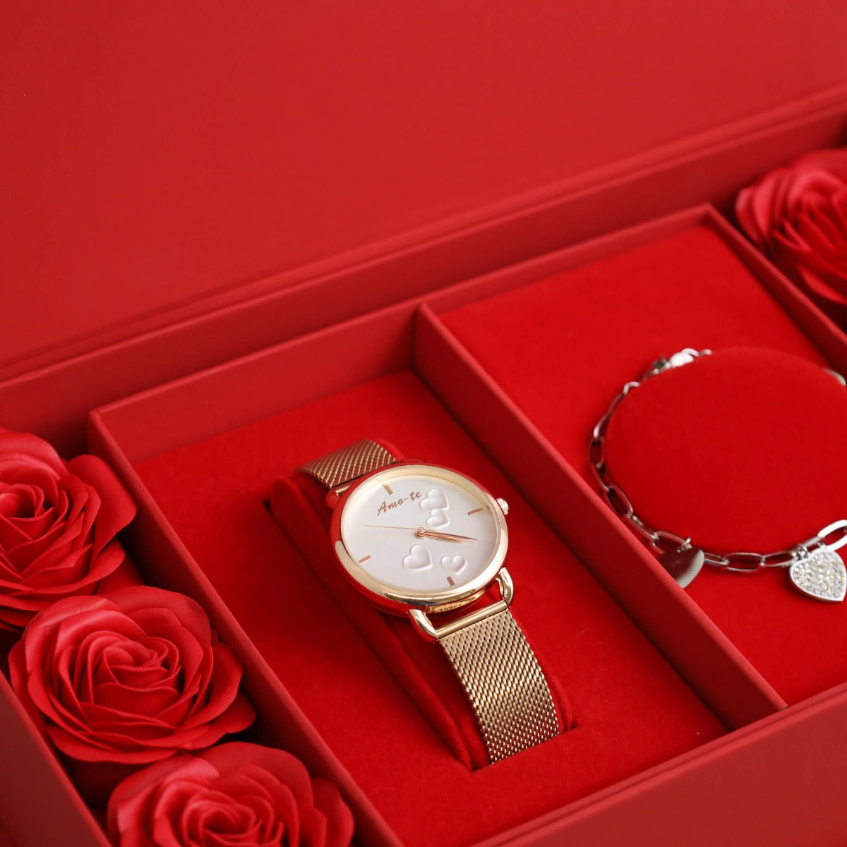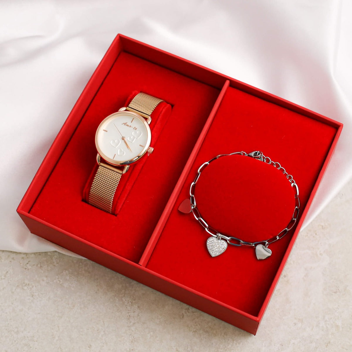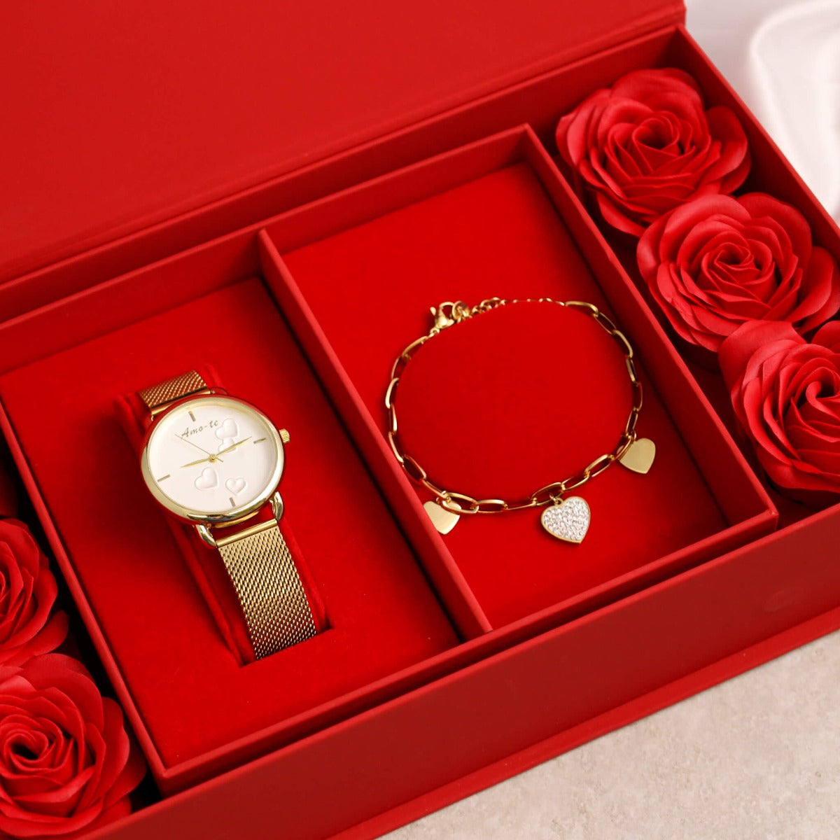 Incluí um relógio em aço inoxidável com dedicatória Amo-te à escolha e uma pulseira em aço aleatória e caixa com rosas.