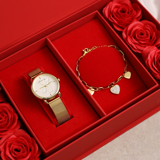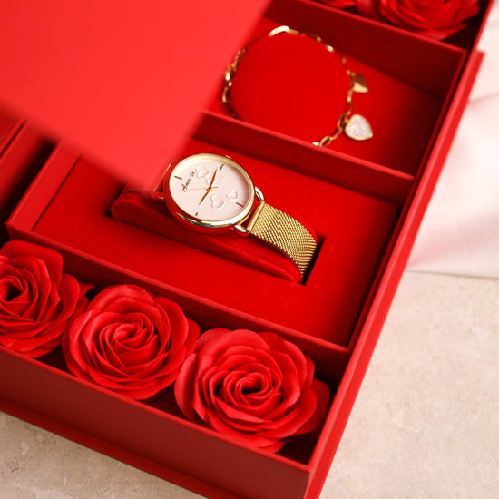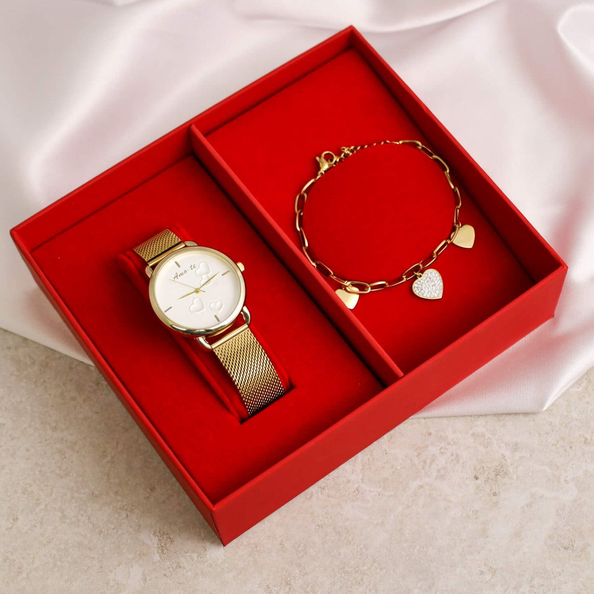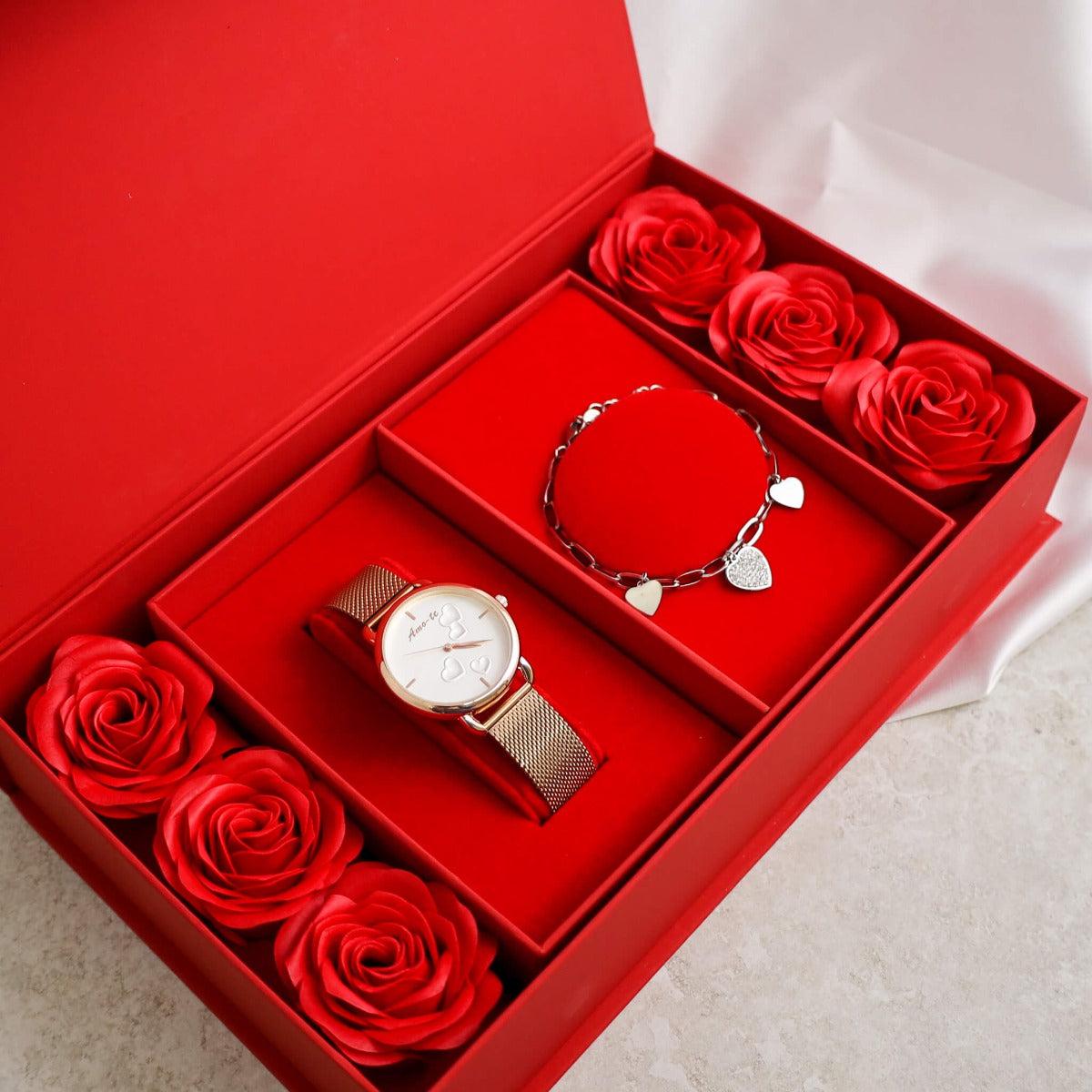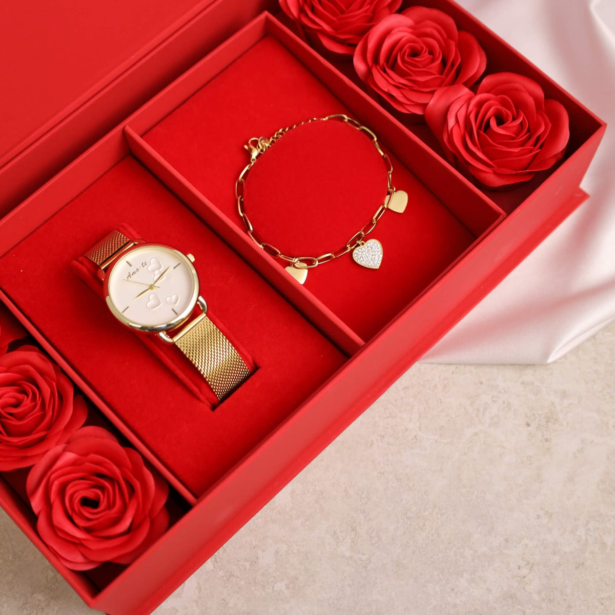 Incluí um relógio em aço inoxidável com dedicatória Amo-te à escolha e uma pulseira em aço aleatória e caixa com rosas.