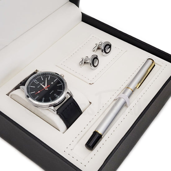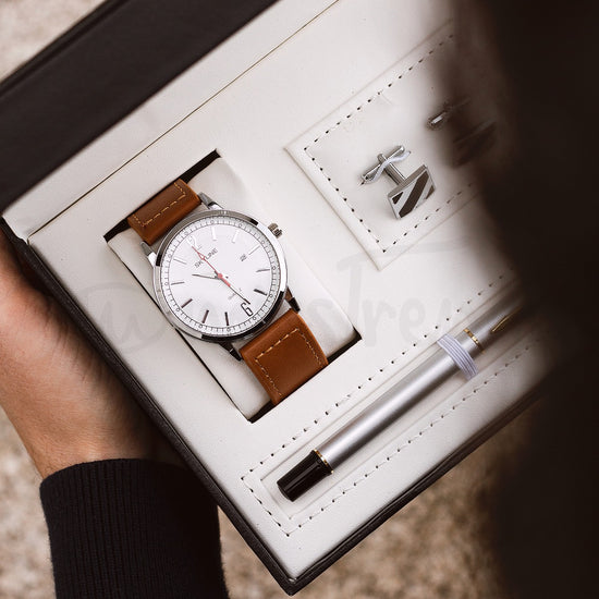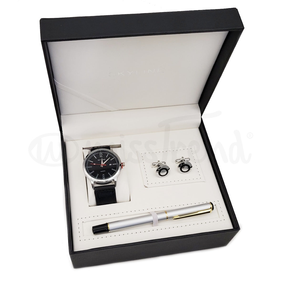 Conjunto Champion para ele. Composto por um relógio em aço e com uma bracelete em couro, botões de punho prateados e uma caneta.