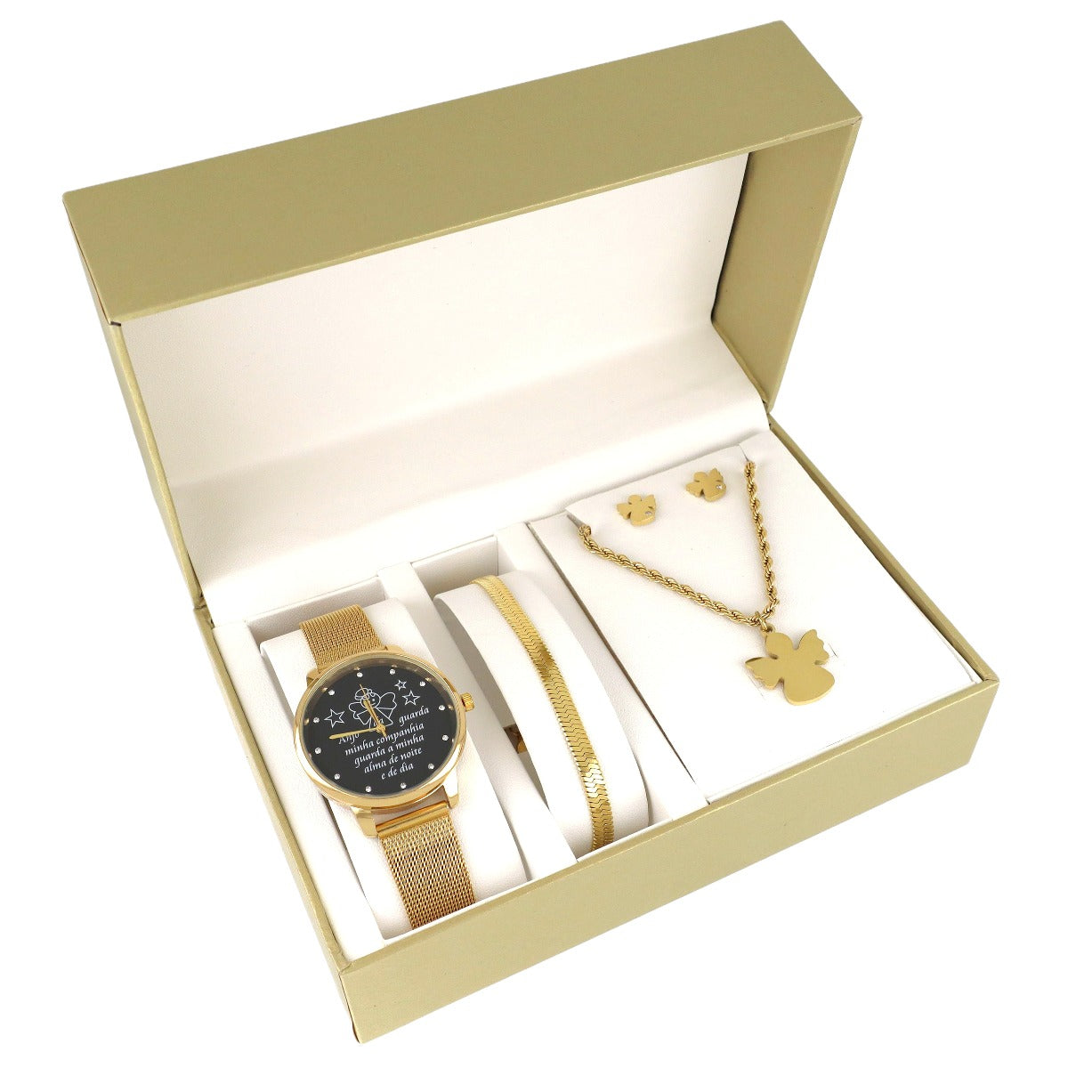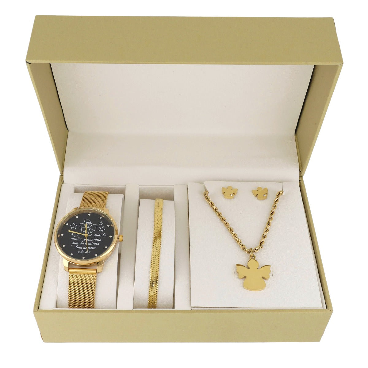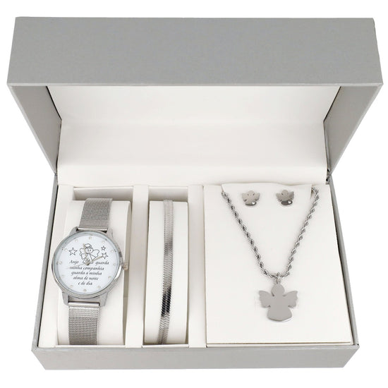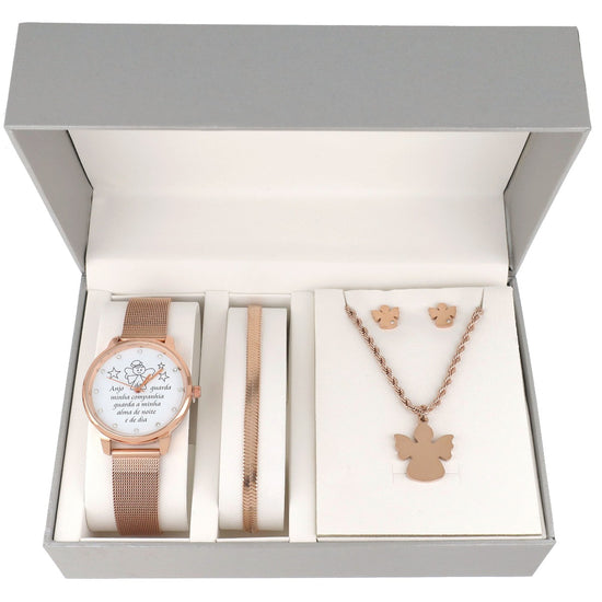 Conjunto especial com relógio com oração " Anjo da guarda da minha companhia guarda a minha alma de noite e de dia" , com colar, pulseira e brincos.