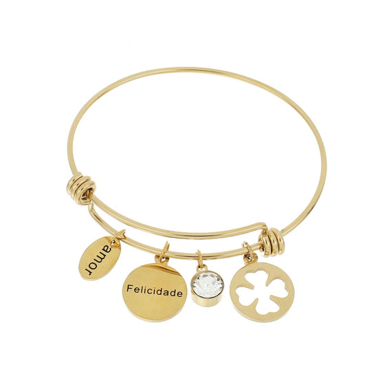 Escrava Trevo com quatro pendentes, pendente trevo, brilhante, pendente redondo com designação felicidade e pendente oval com designação amor.
