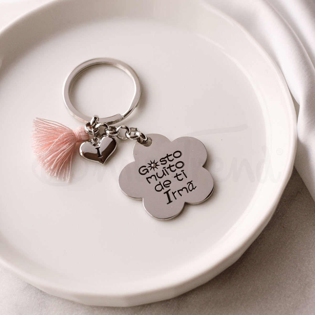 Uma coleção de porta chaves que presta homenagem aos nossos ente queridos. Porta Chaves com pompom colorido e coração com letra gravada da inicial.