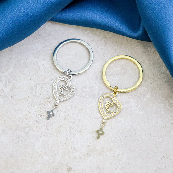 Porta Chaves em forma de coração com Nossa Senhora com brilhantes com pendente cruz. Artigo em aço inoxidável.