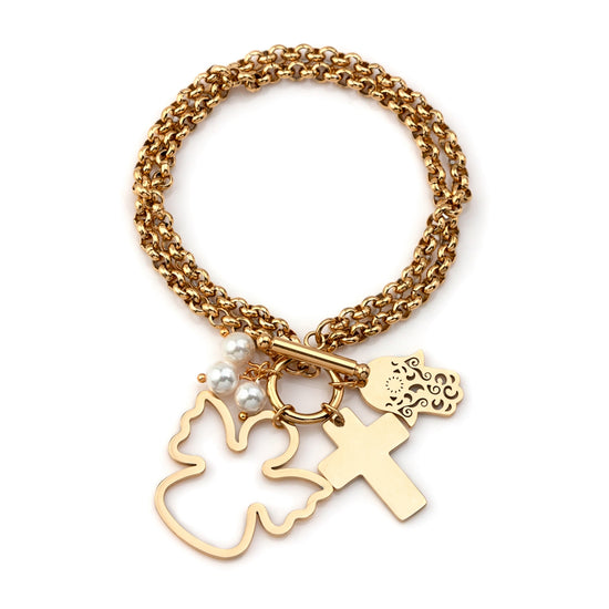 Pulseira Acrus em aço inoxidável. Composta por três pendentes cruz, mão de Fátima e forma de um anjo com três pérolas.