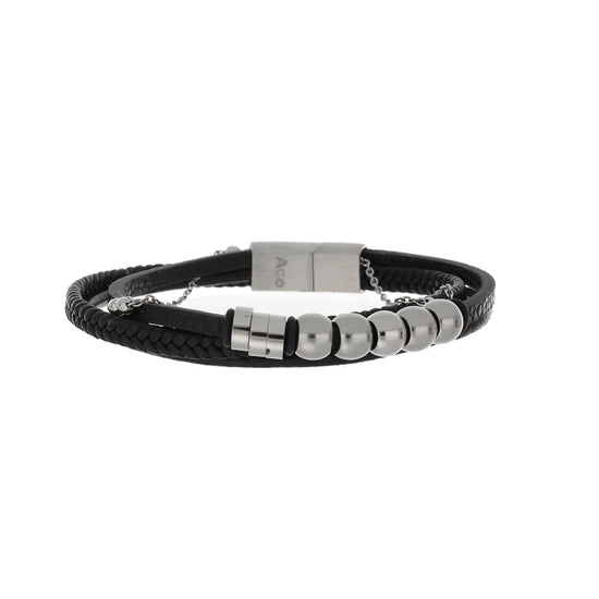 Pulseira masculina Bogata com quatro tiras de texturas diferentes. Três em couro e outra em aço inoxidável.