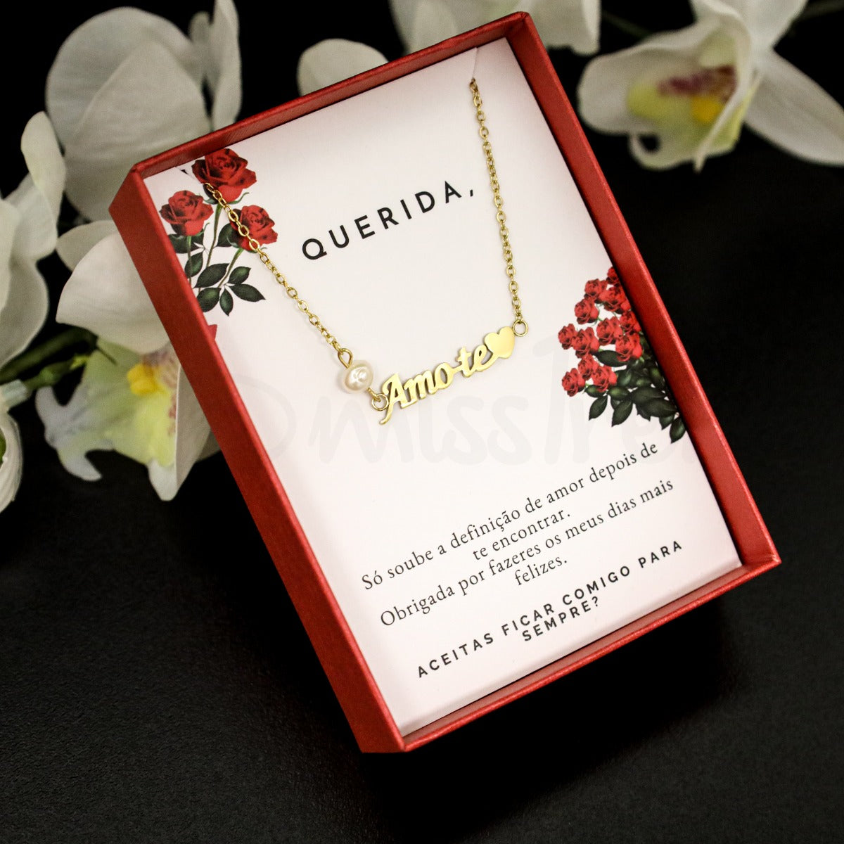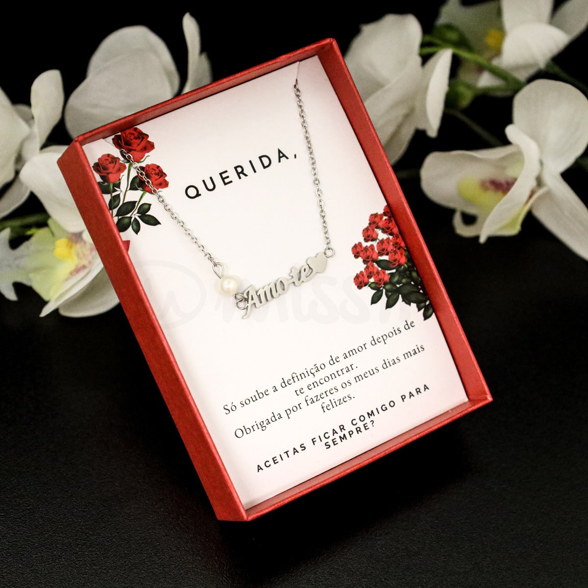 Pulseira com pérola com designação "Amo-te" em aço inoxidável com mensagem.