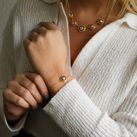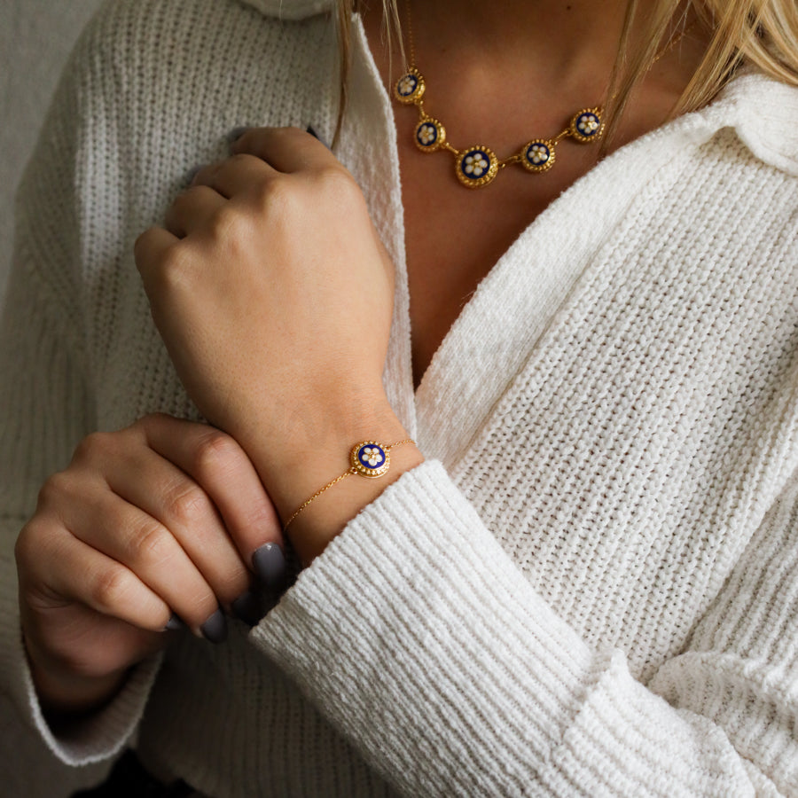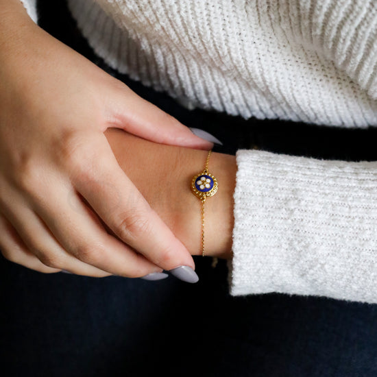 Pulseira ajustável em banho de ouro com flor caramujo.