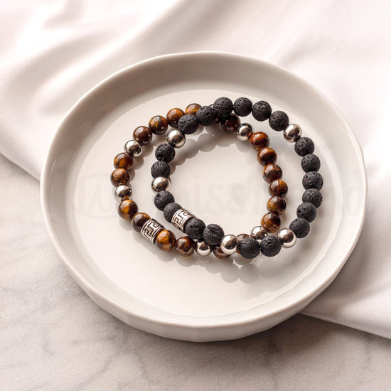 Pulseira com pedras vulcânicas ou em mármore em tons castanhos com bolas em aço inoxidável.