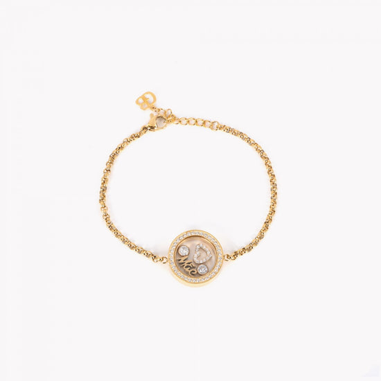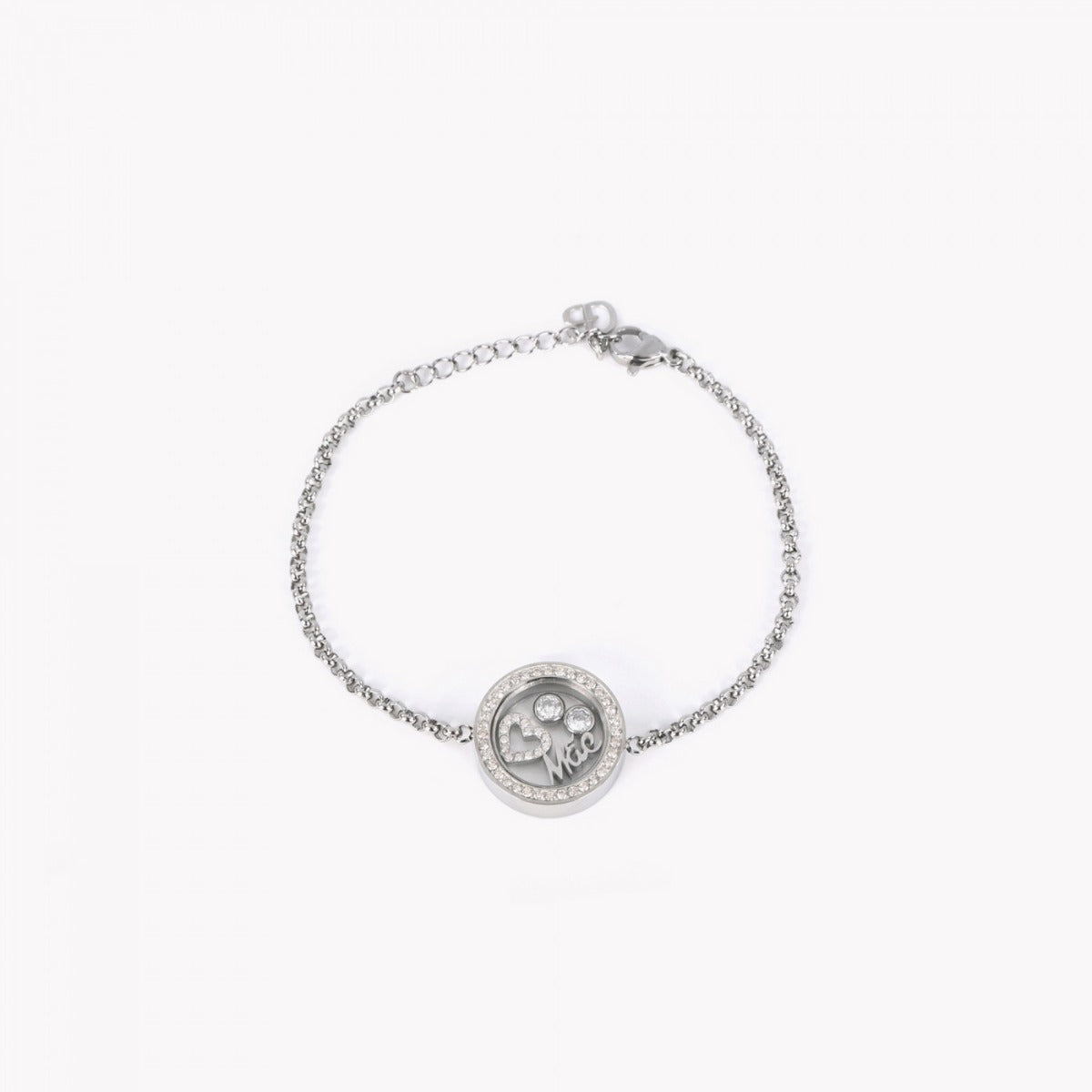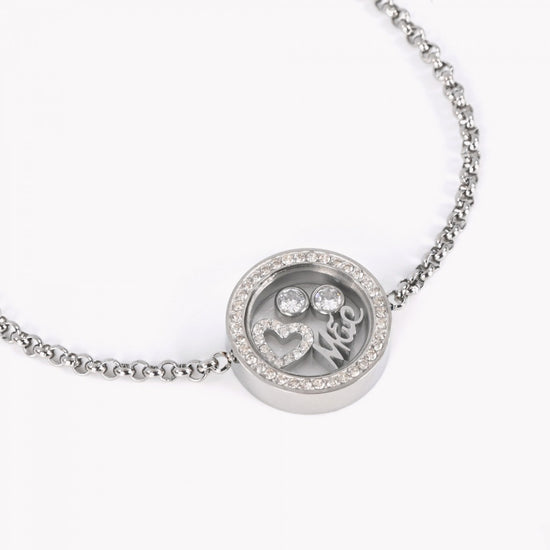 Pulseira com pendente redondo em 3D com dedicatória Mãe e pendentes soltos em formato de coração de brilhantes redondos.