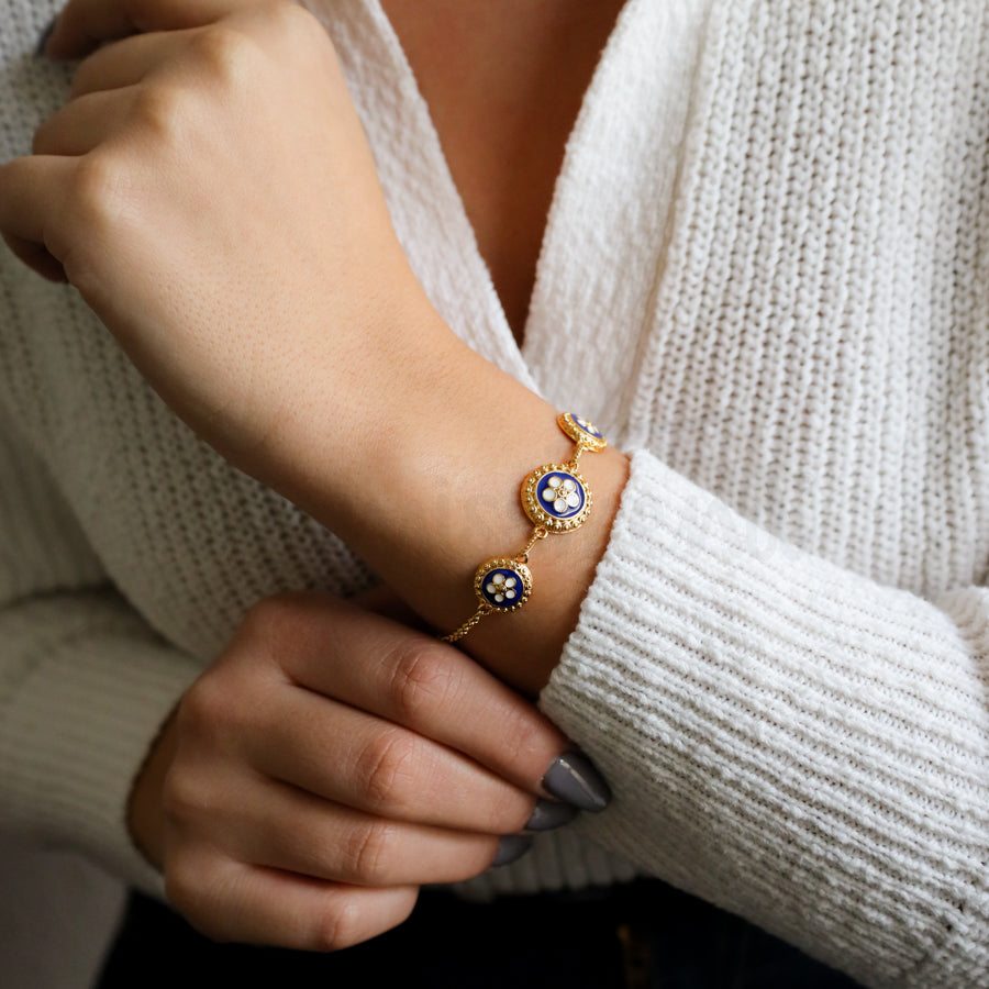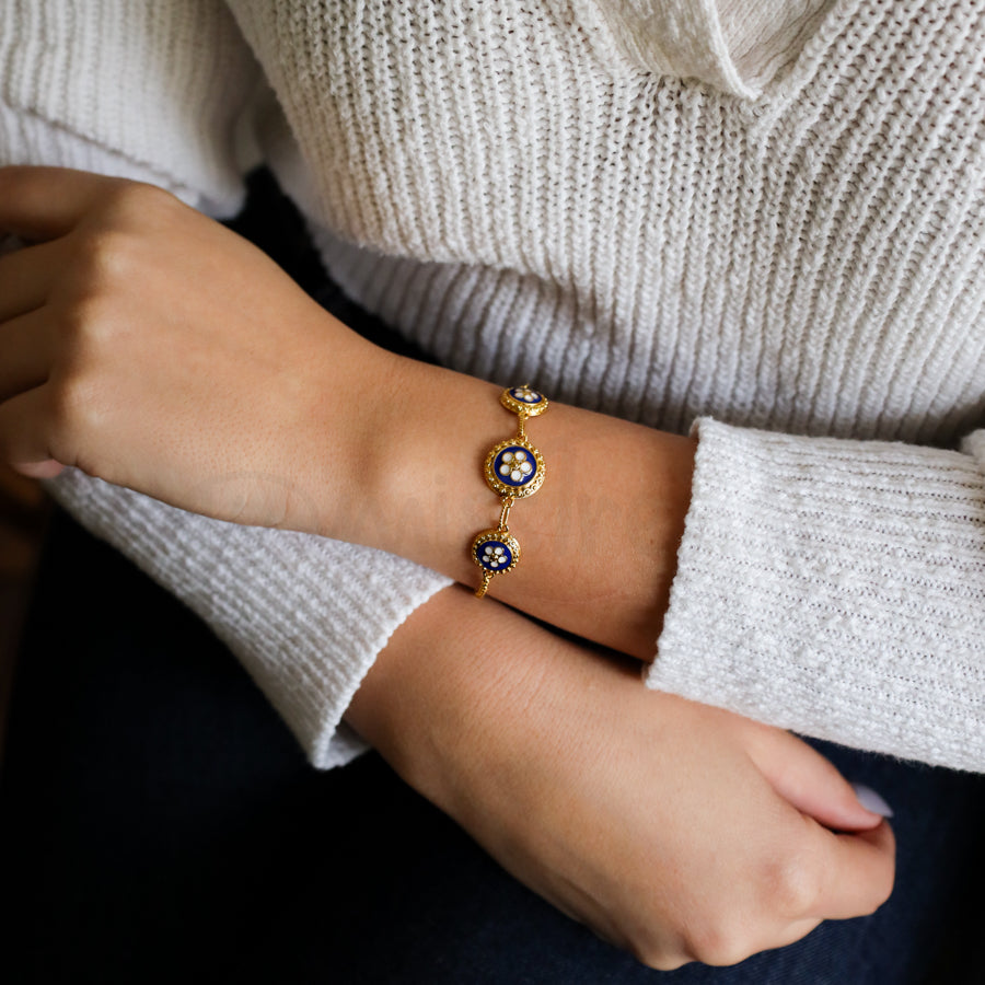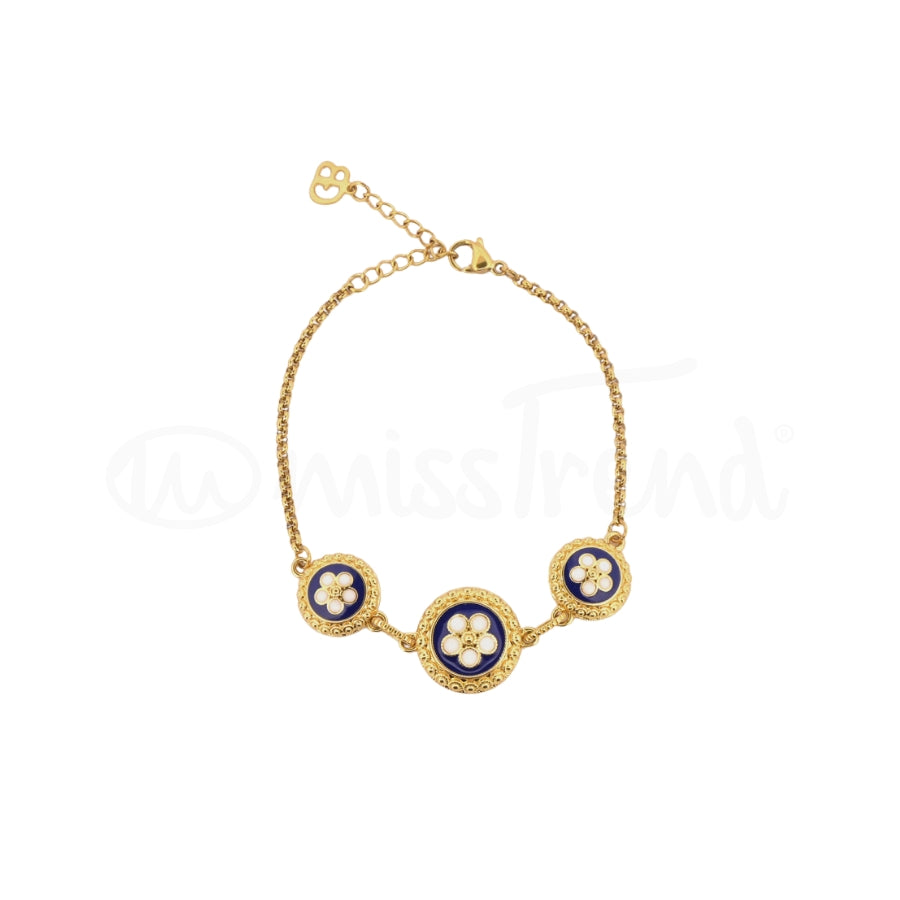 Pulseira ajustável em banho de ouro com multi flor caramujo azul.