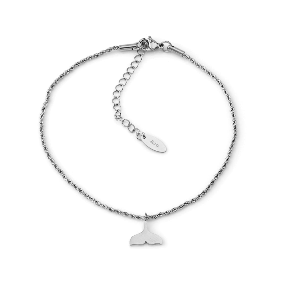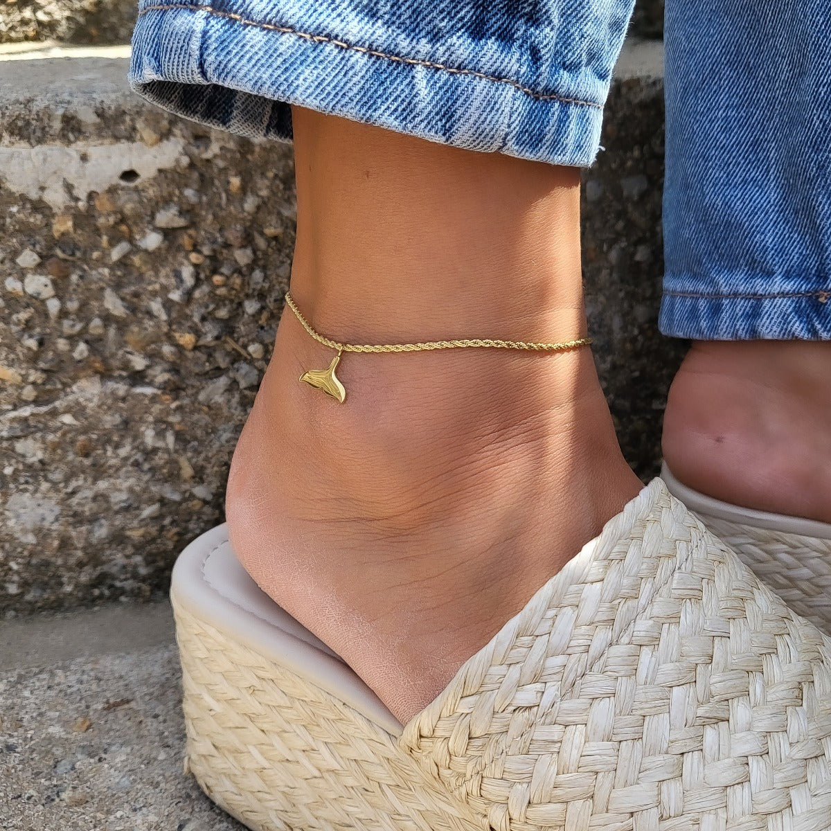 Pulseira de pé composta por corrente entrelaçada com pendente cauda de sereia.