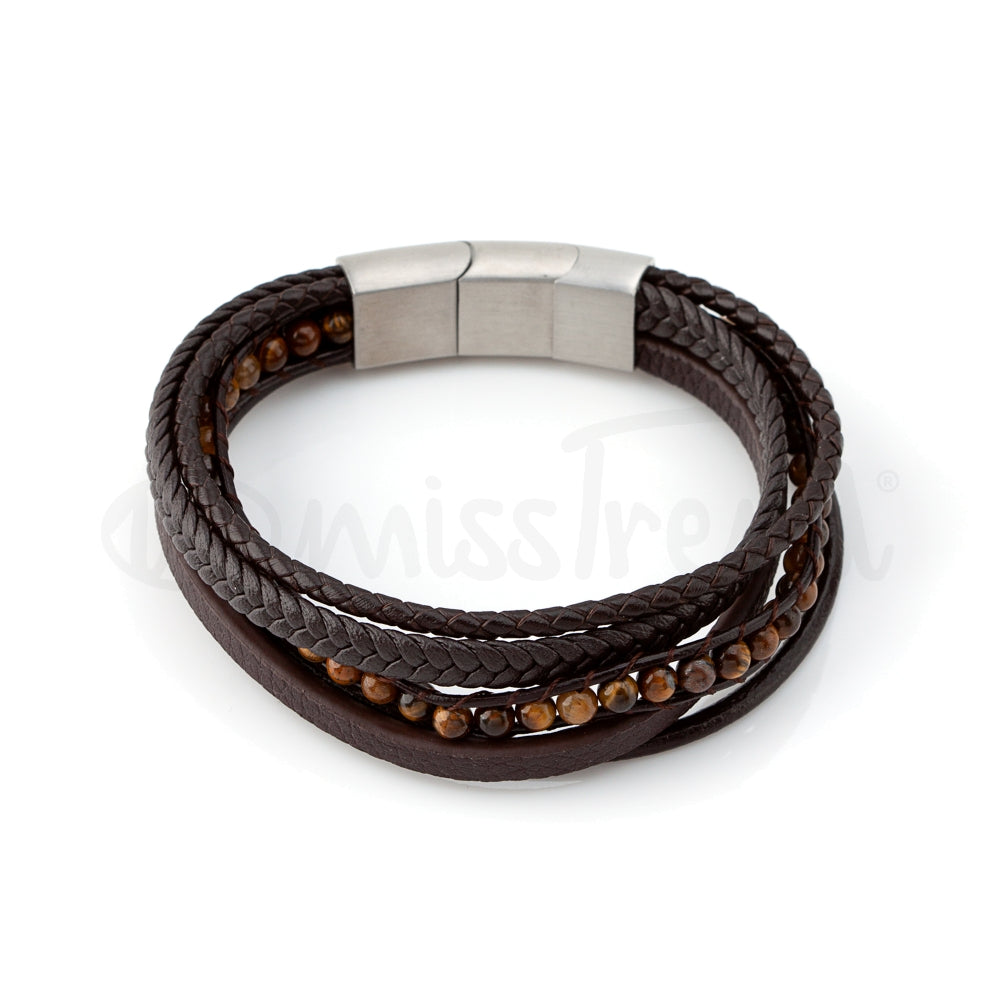 Pulseira masculina Venezuela com quatro tiras em couro de texturas diferentes e únicas . Composta por um fecho de encaixe em aço inoxidável.