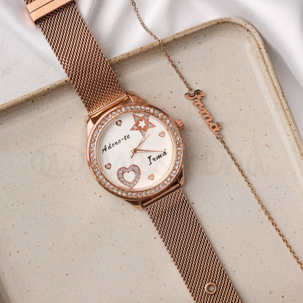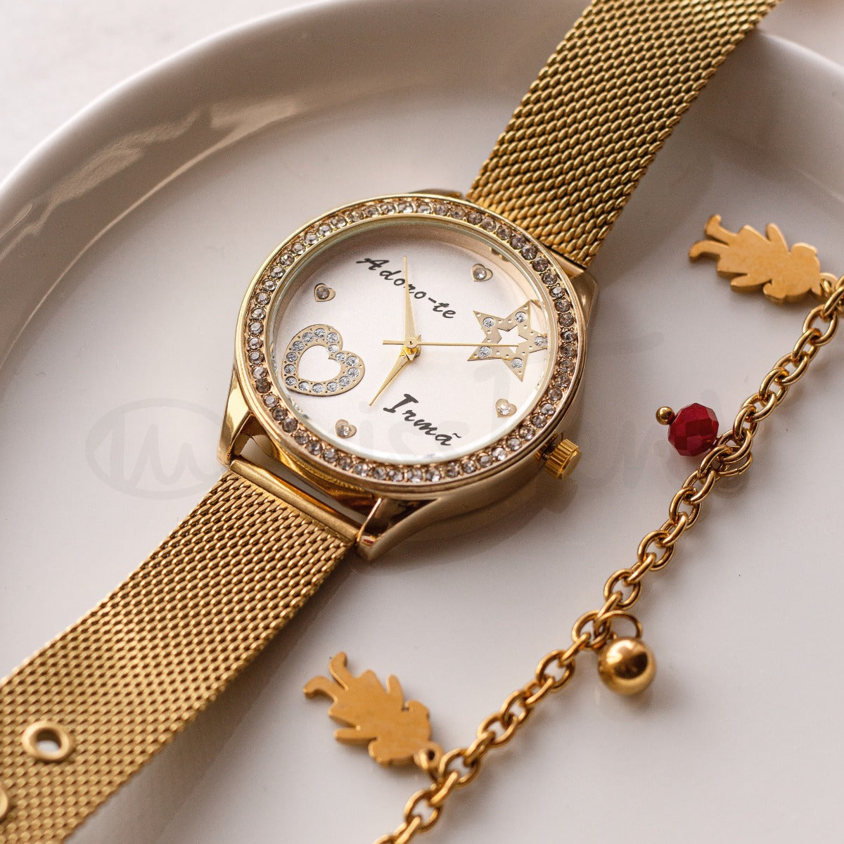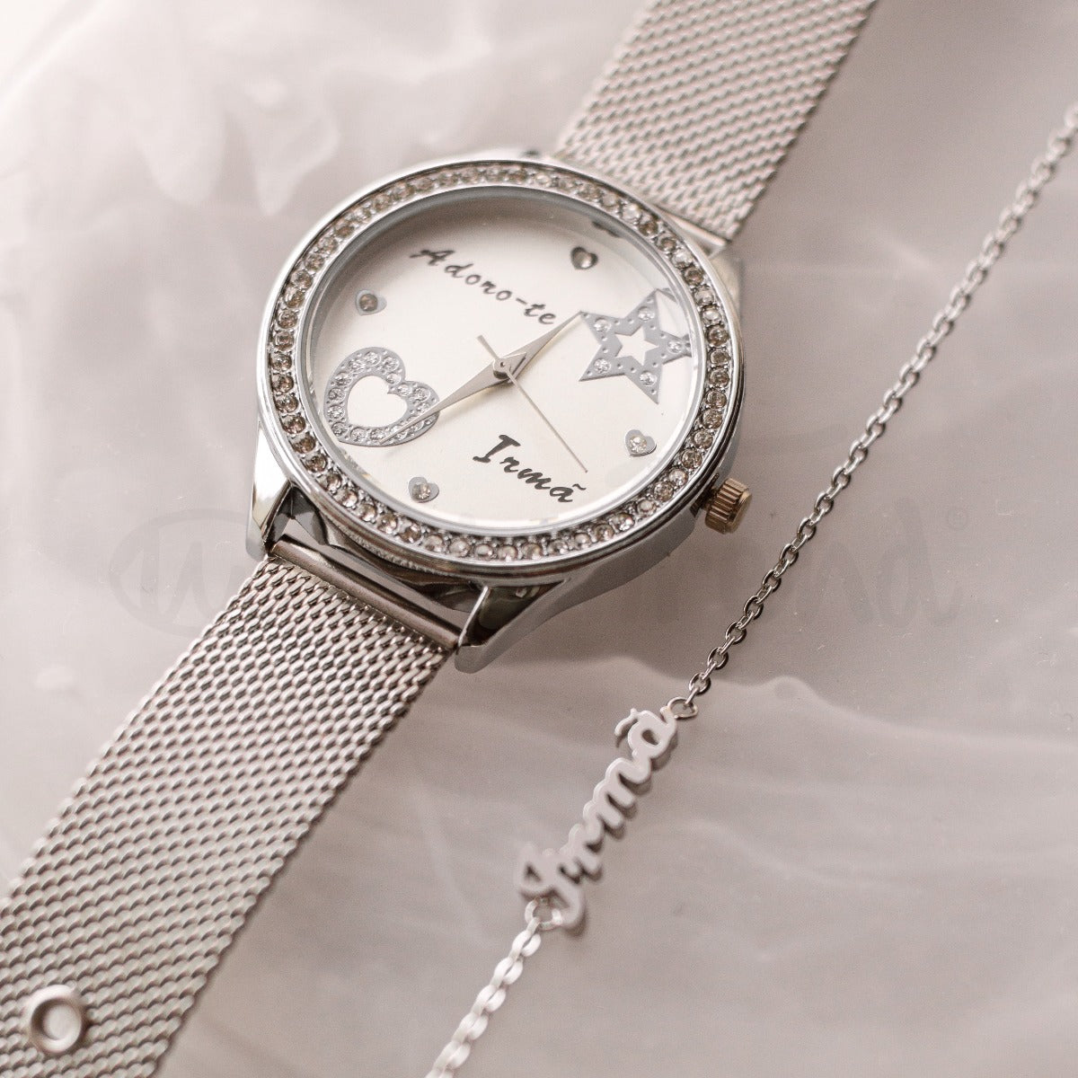 Relógio Adoro-te Irmã em aço. Composto por uma bracelete em aço com fecho fivela com vários furos.