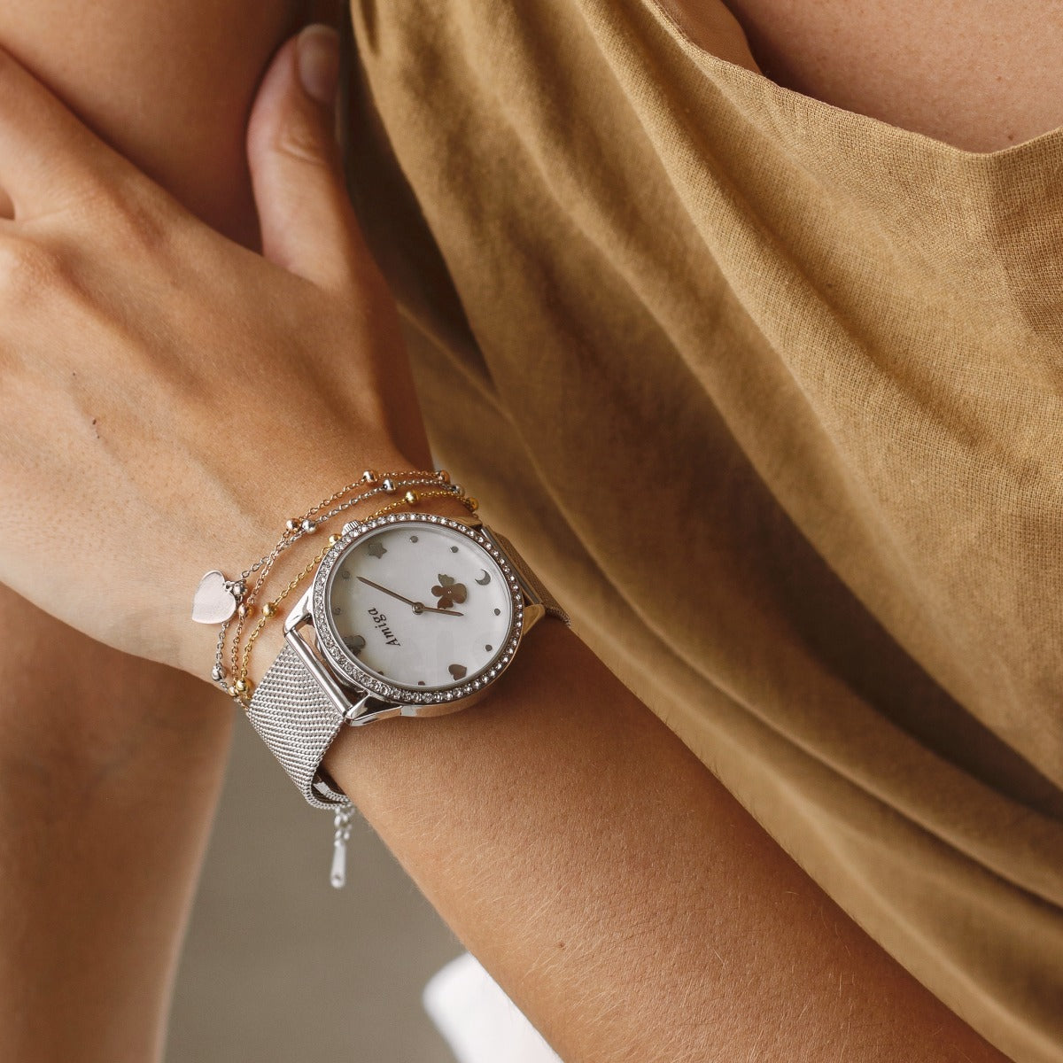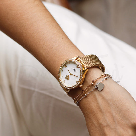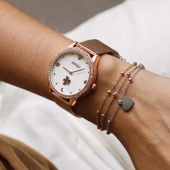Relógio com fundo madre pérola com dedicatória Amiga. Com um design moderno e elegante com um aro repleto de brilhantes e imagens de anjos, flor, lua, coração e estrela.