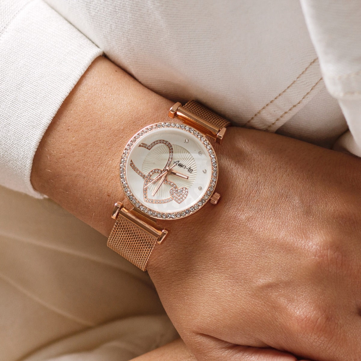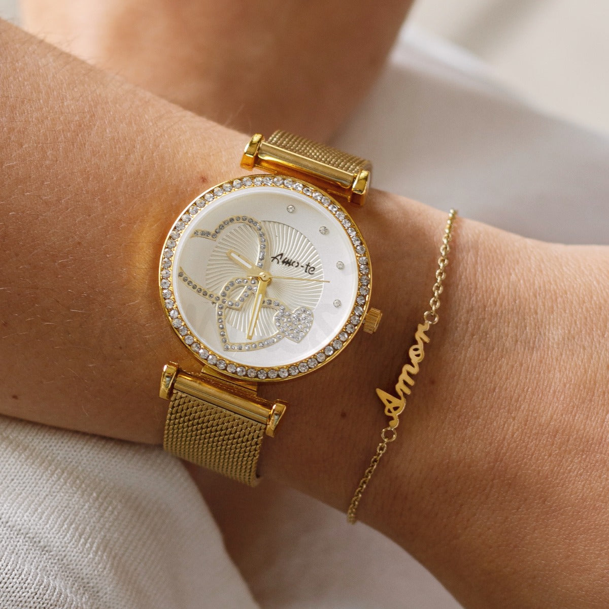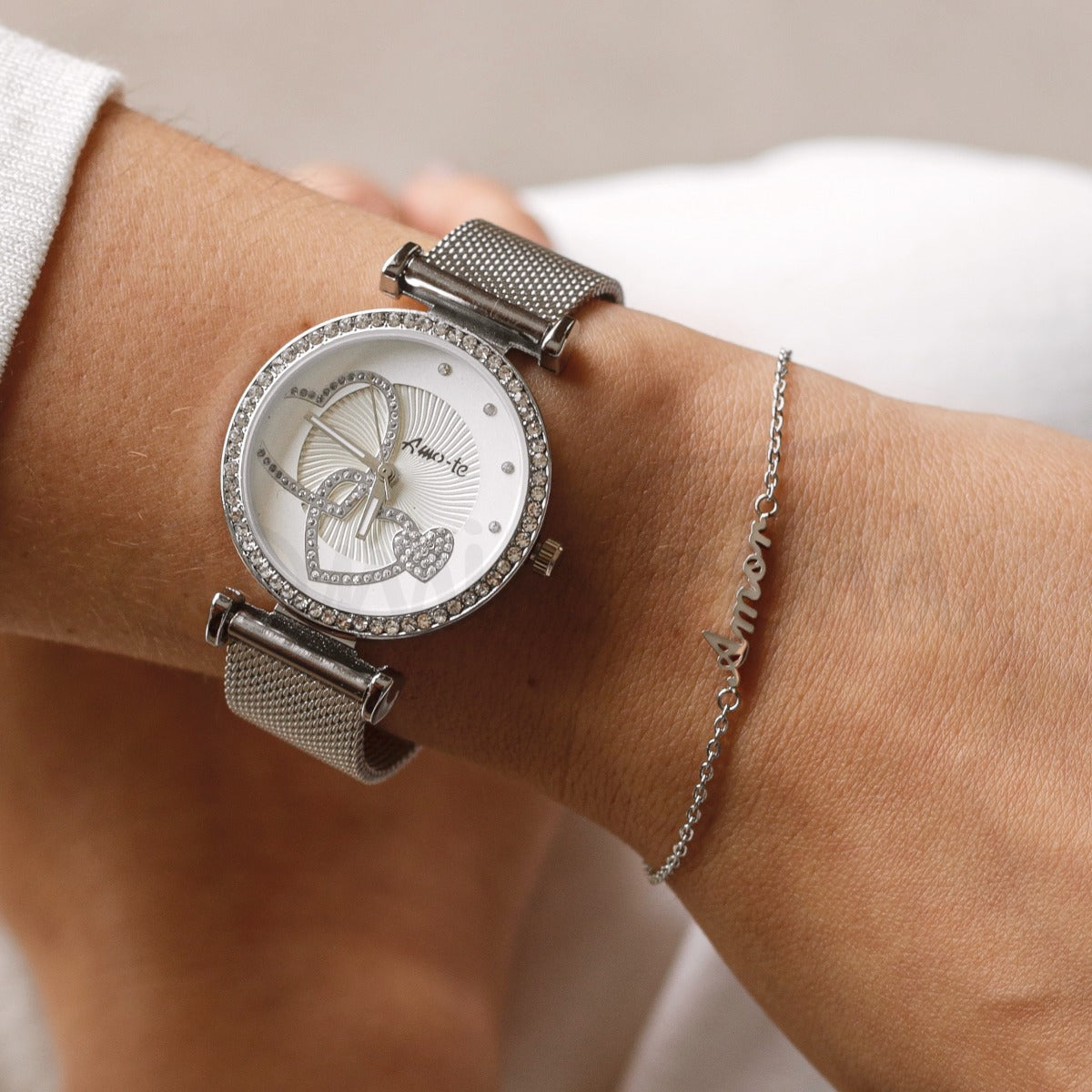 Relógio com dedicatória Amo-te no mostrador . Um design romântico com corações e brilhantes cravado no aro do mostrador. Composto por uma bracelete em aço facilmente ajustável.
