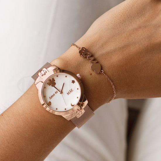 Relógio com dedicatória Amo-te Mãe com mostrador efeito mármore com detalhes metálicos de um anjo, estrela, lua e coração.