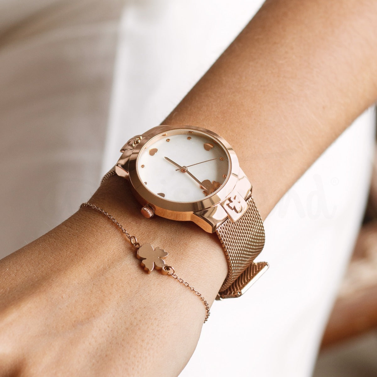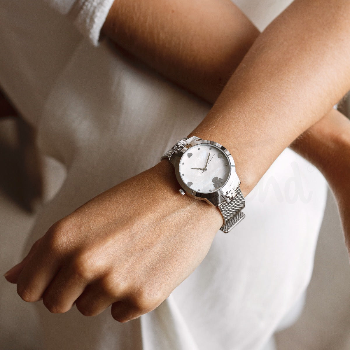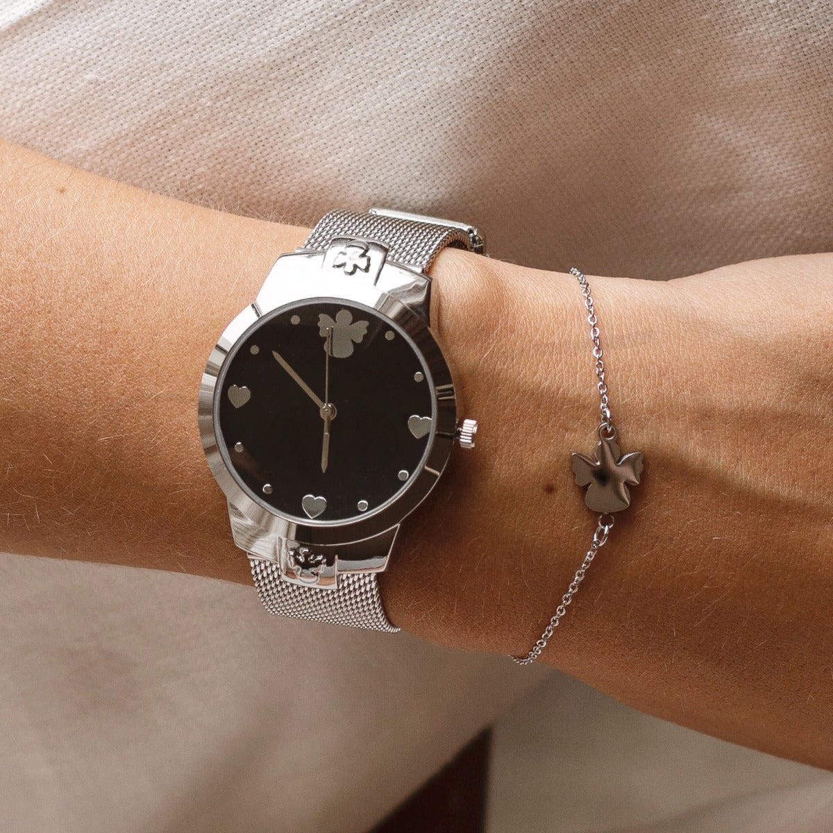 Composto por uma bracelete em aço inoxidável facilmente ajustável.