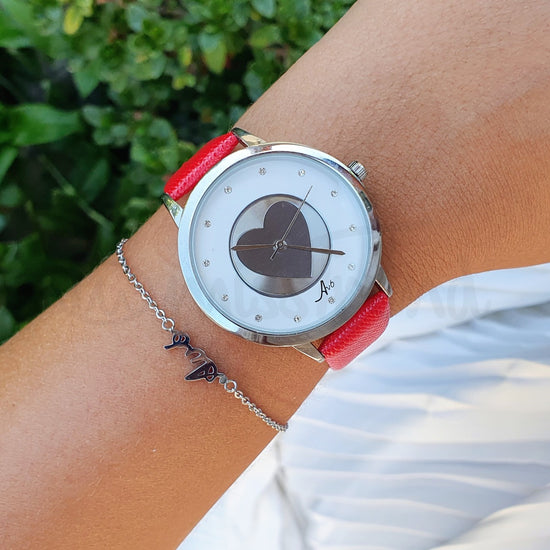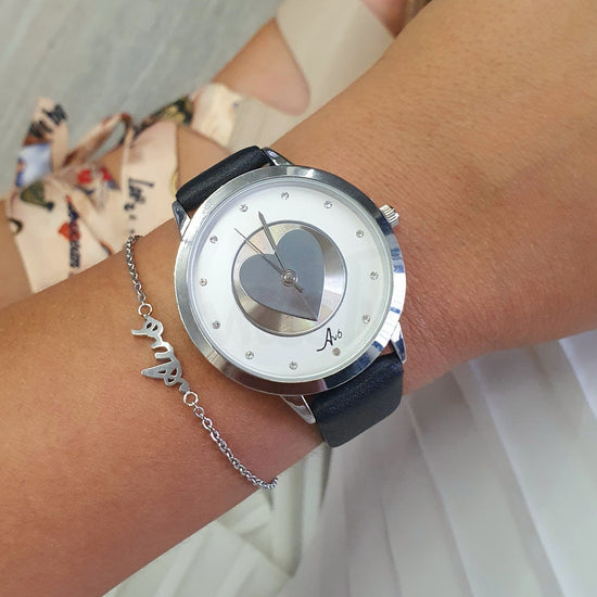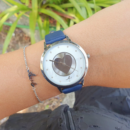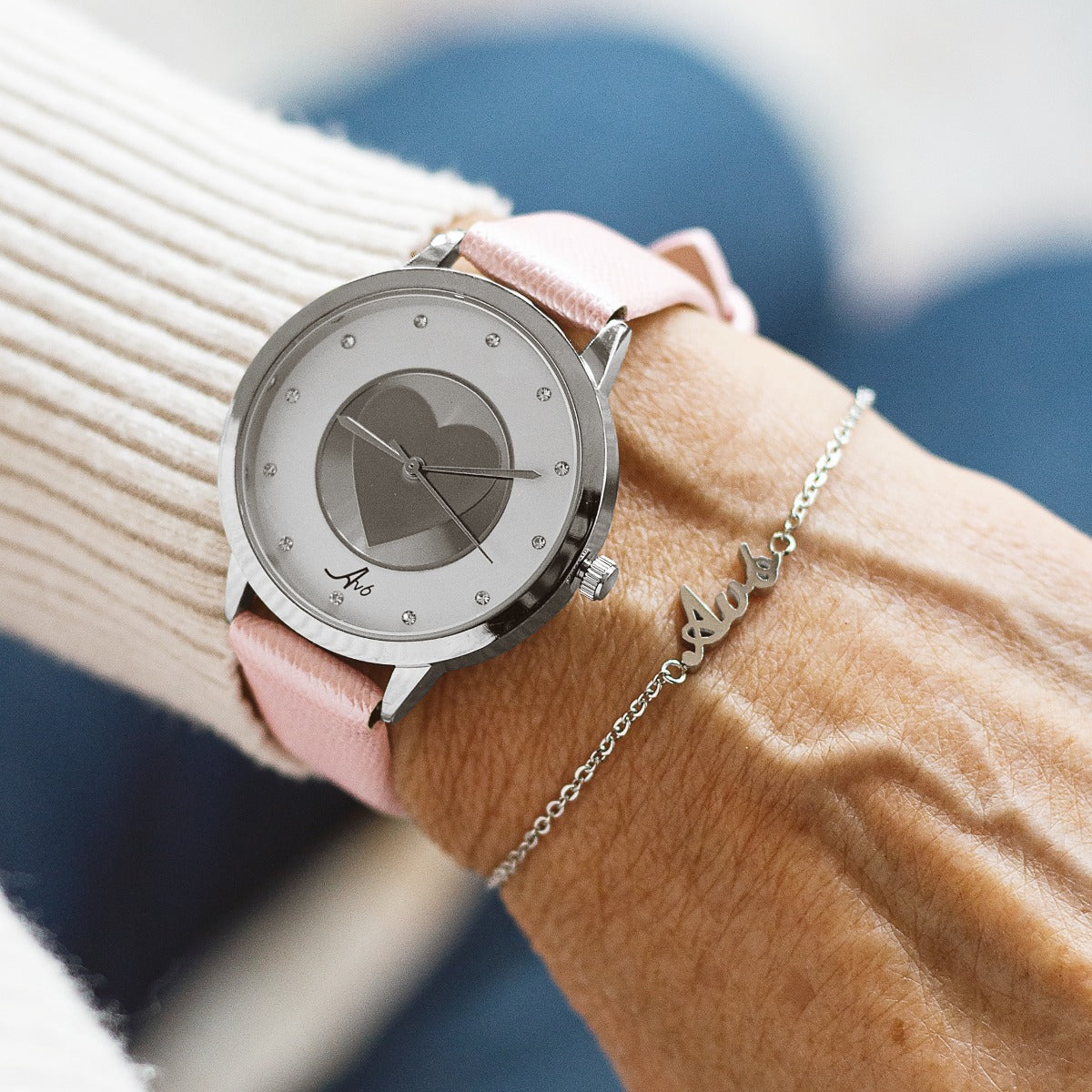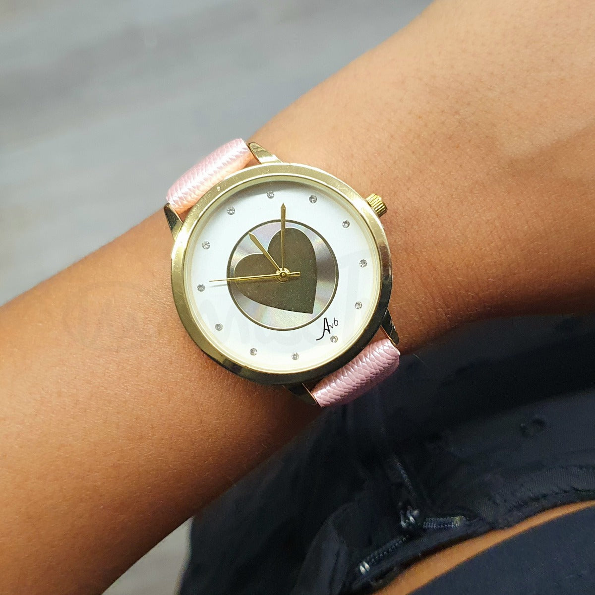 Relógio com dedicatória Avó com coração no mostrador, com bracelete em pele sintética ajustável por furos.