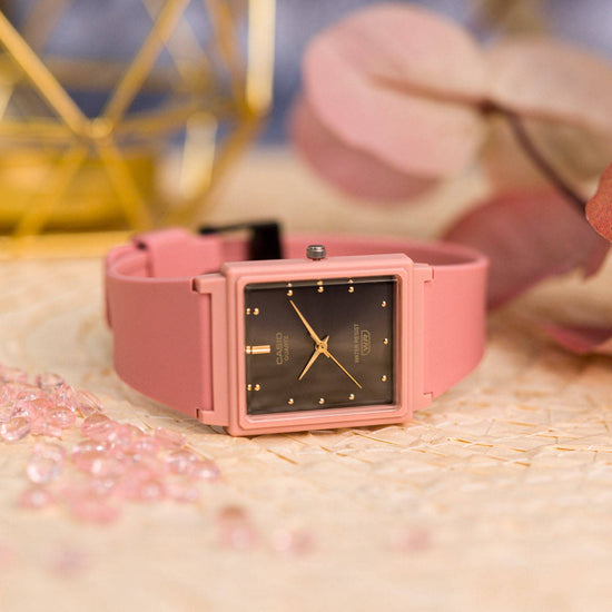 Este relógio Casio é projetado com um design confortável, mas elegante. Com mostrador de fundo preto com pormenores dourados dê um design elegante ao seu look. A bracelete é feita de material de resina compatível e leve. Confortável de utilizar sem perder a elegância de um look sofisticado.