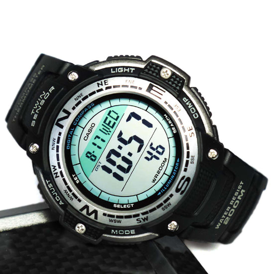 Este modelo inclui leituras de temperatura e direção por sensor duplo num design com resistência à água de 200 metros, perfeito para desportos, trabalho ou outras atividades que envolvam água. Além da hora mundial, cronómetro, alarme e outras funções básicas de indicação das horas, este modelo também inclui um sensor de direção e um sensor de temperatura.