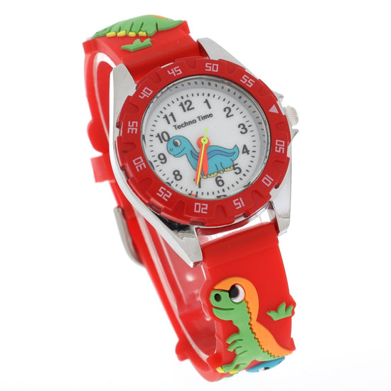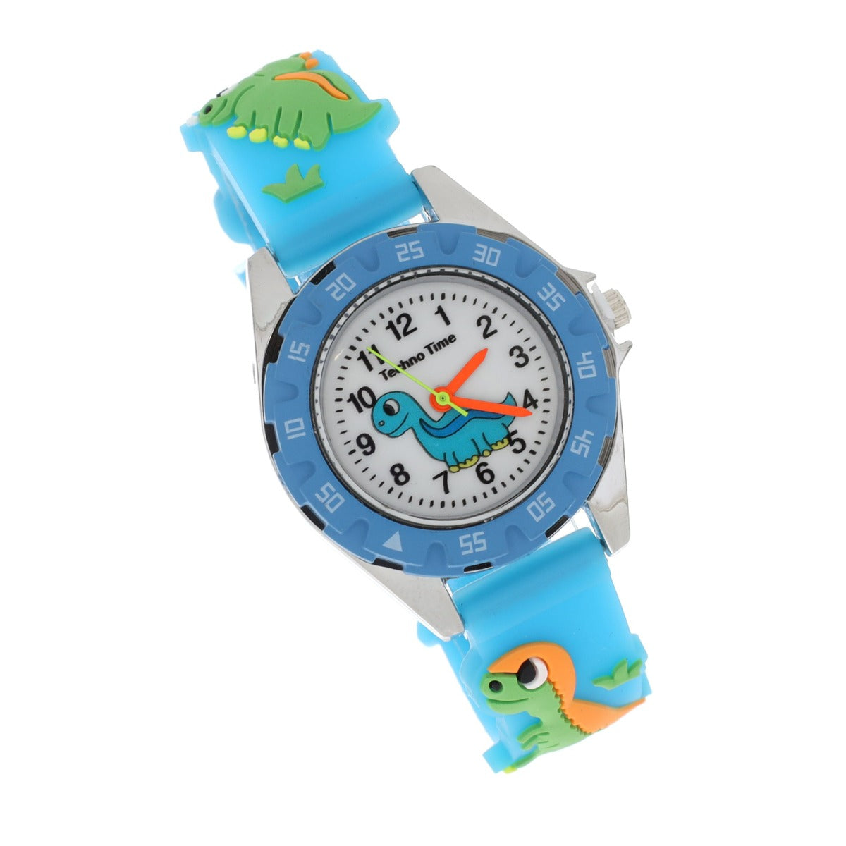 Relógio de criança com imagens de dinossauros. Composto por uma bracelete em silicone respirável.