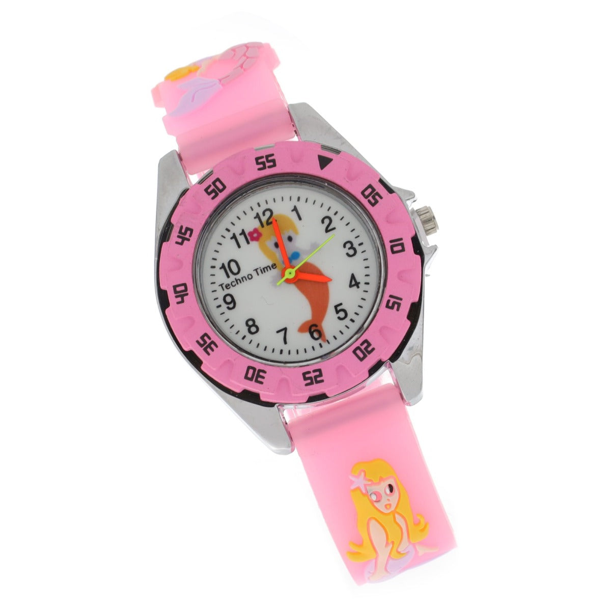 Relógio de criança com imagens de sereias. Composto por uma bracelete em silicone respirável.