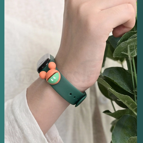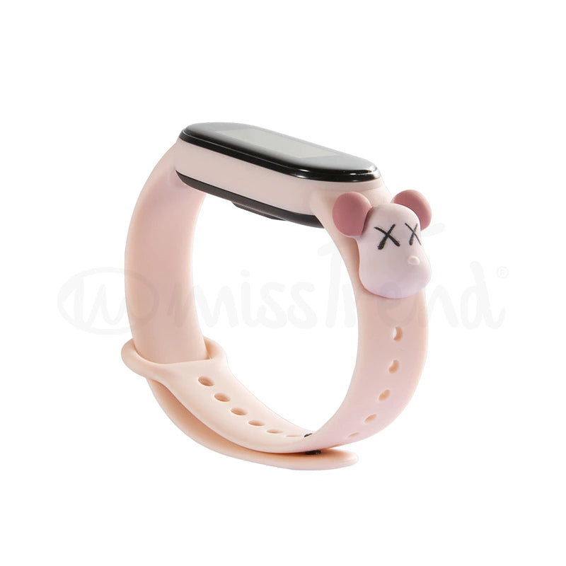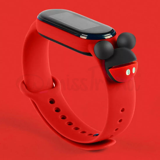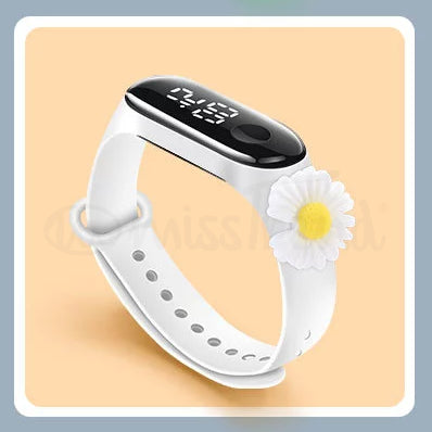 Relógio digital de criança em silicone com mostrador de data e hora, composto por uma bracelete em silicone com desenho animado incorporado.